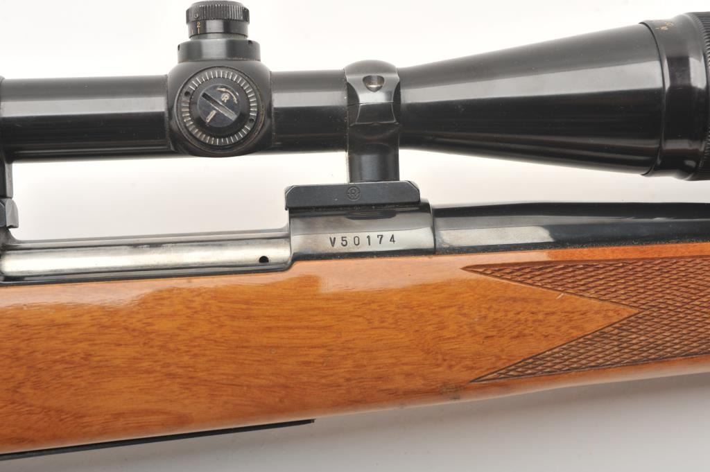 Weatherby Vanguard Deluxe #V50174, .270 WCF cal., 24” barrel, blued finish, deluxe checkered hardwood stock with rosewood caps and rubber butt plate. Rifle is in very good plus condition, showing 95% plus original finish, thinning at the muzzle. Some minor scuffs and dings from storage and use. Mounted with a Redfield 4-12x scope with good optics. (Modern/PPT) Est. $800-1600