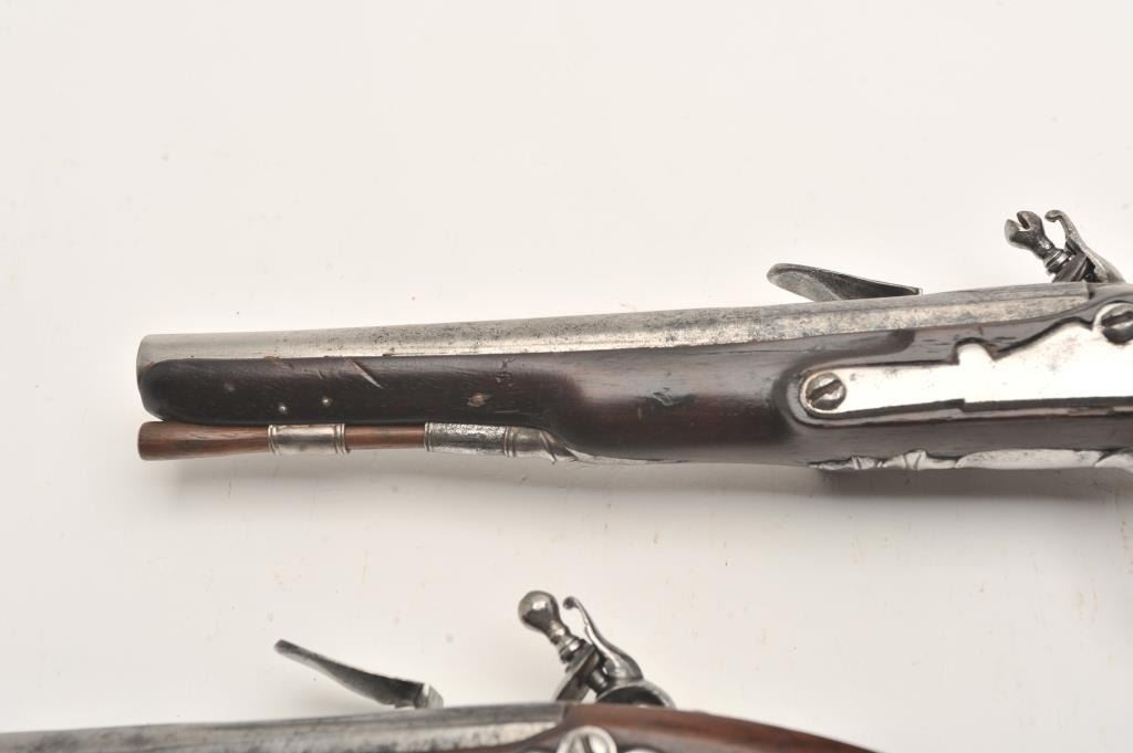 Pair of 18th century flintlock pistols with locks signed “Batvi A Cleirac”. Iron mounts. The barrels have been shortened and restocked in 19th century. Measures 15” overall with a 9” barrel in .52 caliber smoothbore. Metal surfaces show light cleaning and some pitting. The stock is very good. Est.: $1000-$2000