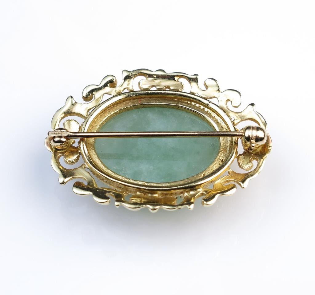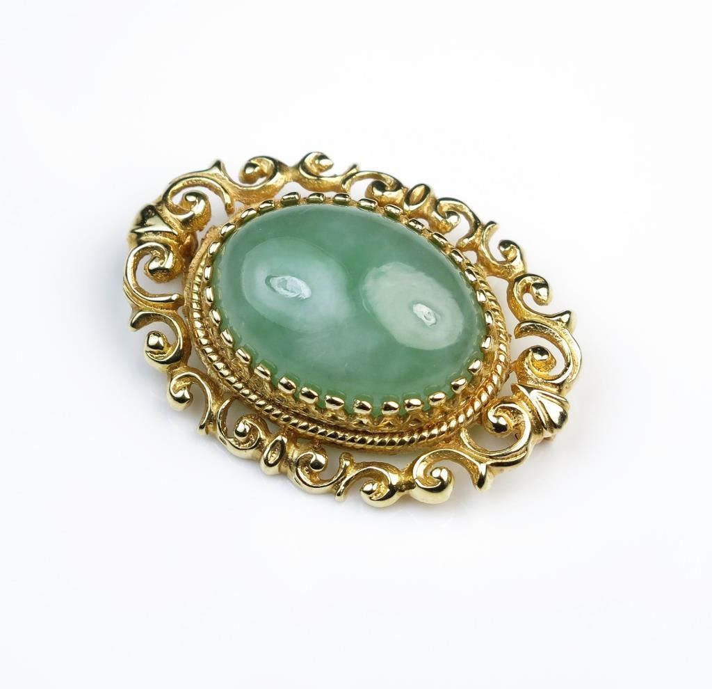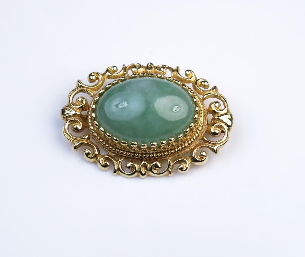 Lovely Heirloom Green Jade Brooch set in Victorian style 14 karat yellow gold setting. Estimates $800-$1,200