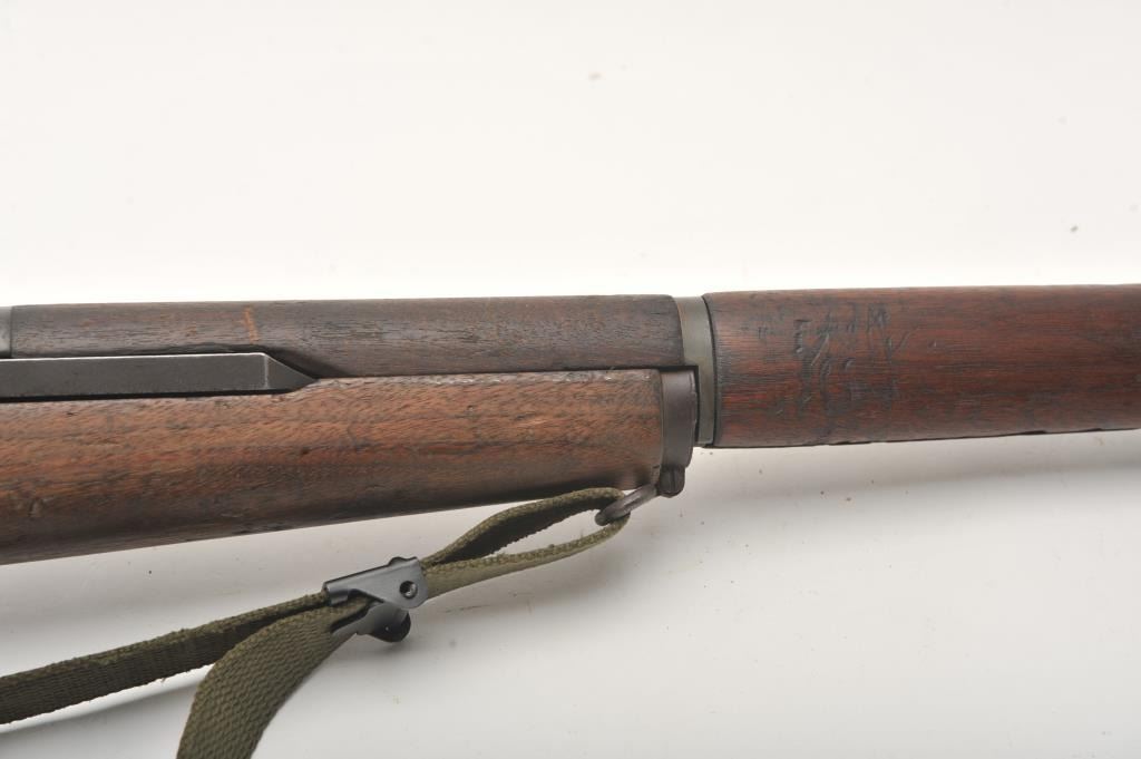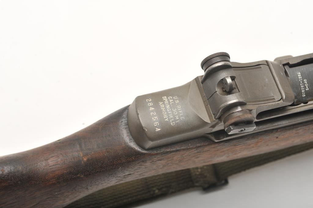 U.S. Springfield Armory M1 Garand semi-automatic rifle, .30 caliber, 24” SA barrel dated 5-44, military finish, wood stock, olive green woven sling, S/N 2842564; overall good condition with majority of military finish remaining, good bore, crisp action and sharp markings; wood stock shows wear with considerable scattered old mars and scratches from carry and storage. (C&R). Est.: $800-$1,600.