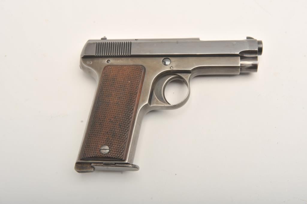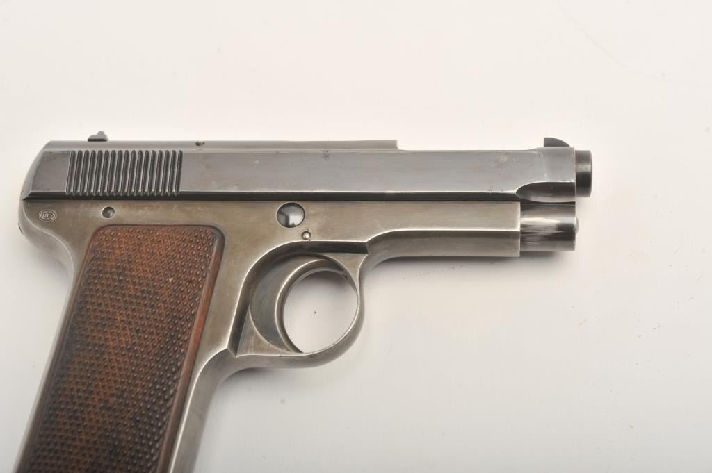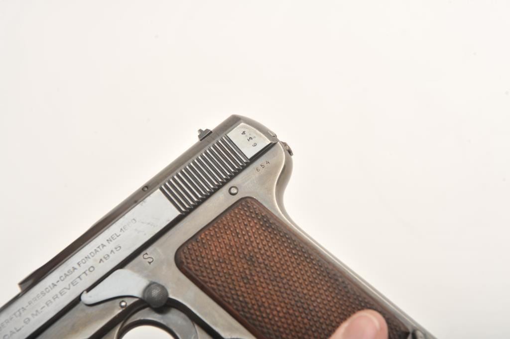 Beretta 1915, .380 ACP, 3 5/8" barrel, high polish blued finish, fixed sights, checkered wood grips. Pistol is in very good condition overall, retaining the majority of it's blued finish, bore is good, with some spots of erosion, grips are very good, action does not seem to reset. One correct mag. (C&R/PPT) Est. $350-700