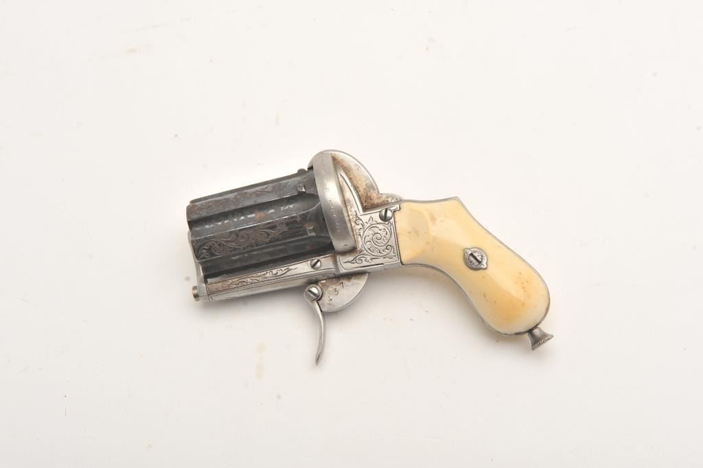 Pinfire pepperbox revolver engraved with ivory grips in 7mm with six shot cylinder intregal with barrel like pepperbox. Only 5” overall. Barrel cluster shows 70%-80% bright blue with minor surface rust and erosion that may clean. Crisp French gray frame. Near fine original to the period ivory grips. Extractor rod retained. No proofs or markings visible. Est.: $750-$1500
