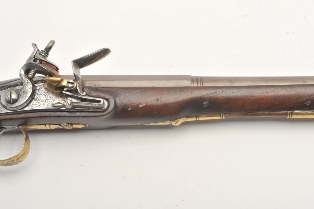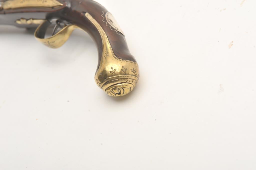 Unusual late 18th to early 19th century continental flintlock pistol with lock signed “L Lvis, EOP”. The styling shows Spanish and Italian influences but country of origin not certain. The barrel is signed in Mid-Eastern letter characters. Measures 15” overall with a 9 ¼” barrel of .60 caliber smoothbore. Silver oversize plaque in wrist. Has had crest or letters polished out long ago. The condition is very good overall. Possibly unique. (Antique) Est.: $600-$1200