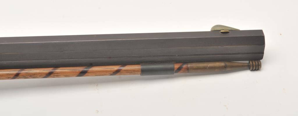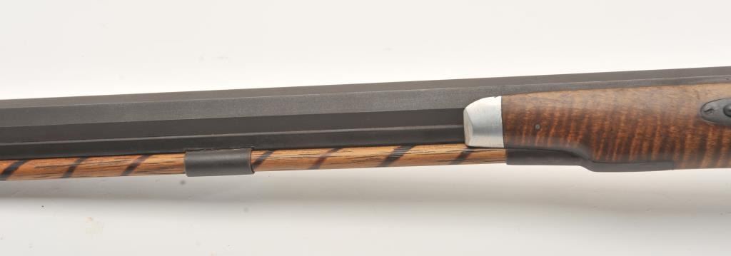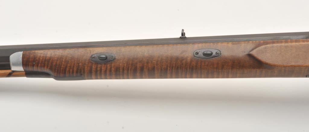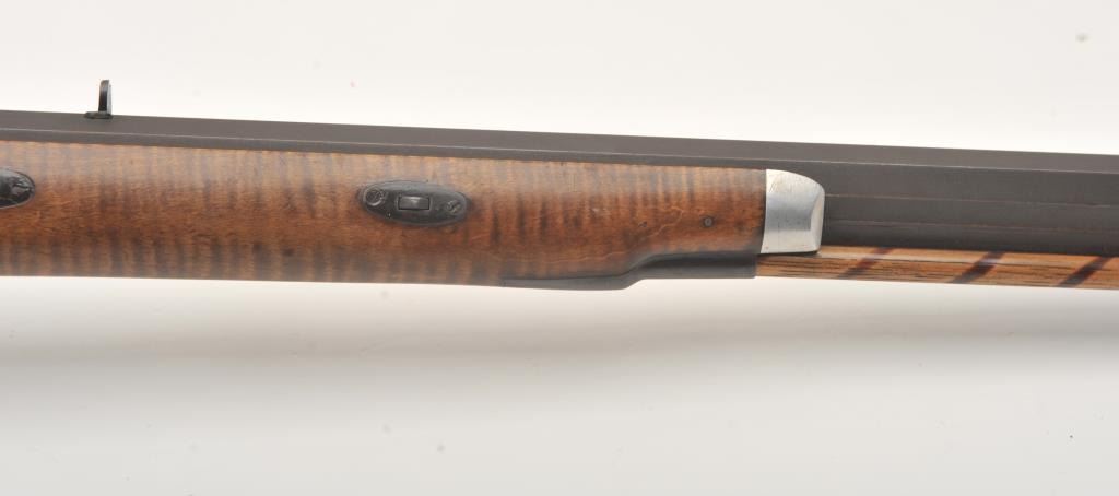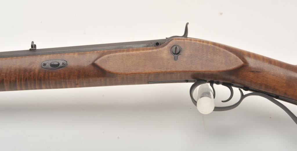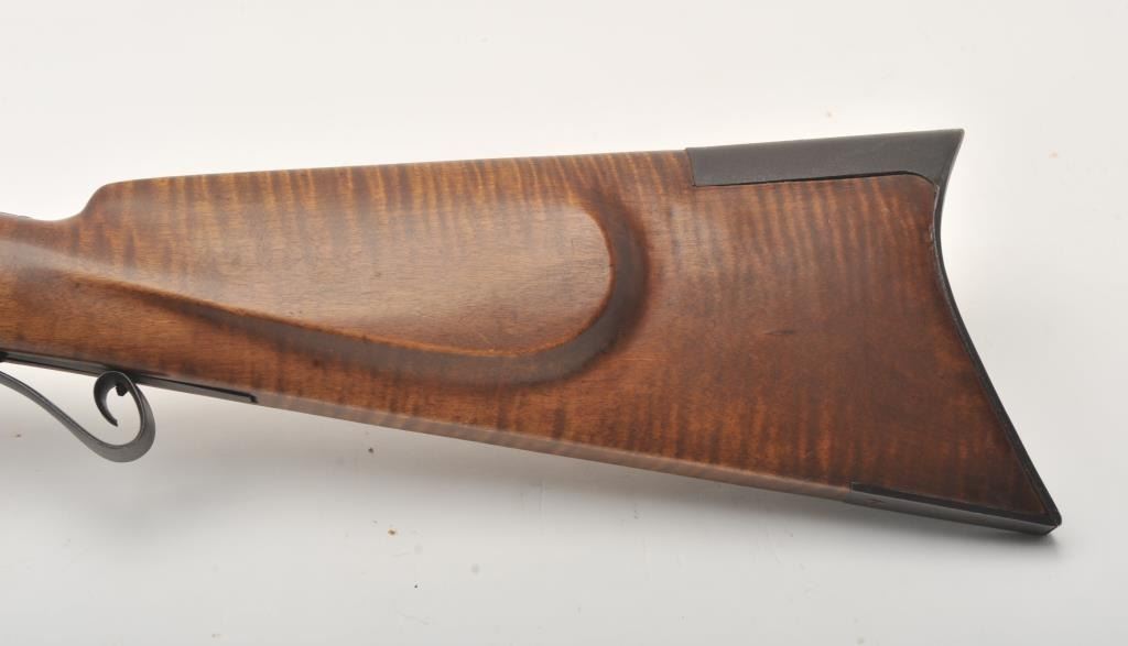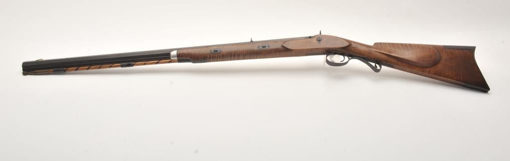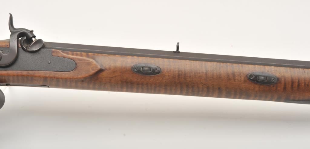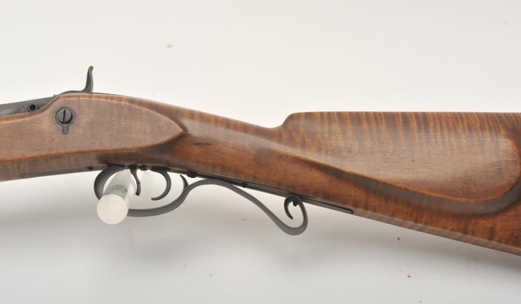 Fine half stocked Hawken style custom percussion rifle, .50 caliber, 33” heavy octagon barrel marked “R.J. Butcher”; double set triggers (not working at time of description); quality tiger striped wood stock; overall very good; very authentic in appearance and detail. (percussion). Est.: $600-$1,200.