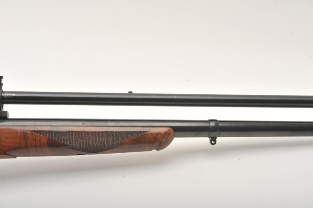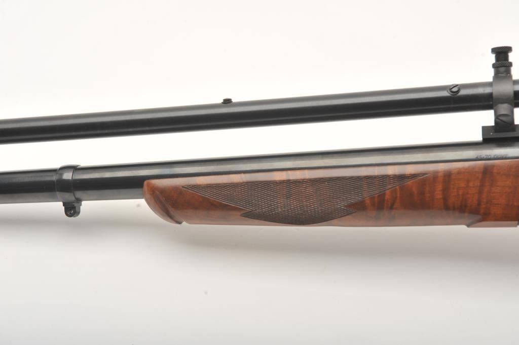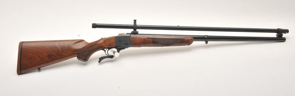 Ruger Lyman Centennial Edition (1878-1978) No. 1 single shot rifle, .45-70 Gov’t caliber, 28” round barrel, blued finish, checkered wood stocks, S/N 131-41554, mounted with a Lyman Centennial full length scope displaying crisp optics; overall fine condition showing little use; fine bore, action, markings and beautifully grained fine wood stocks. (Modern/NO PPT). Est.: $600-$1,200.