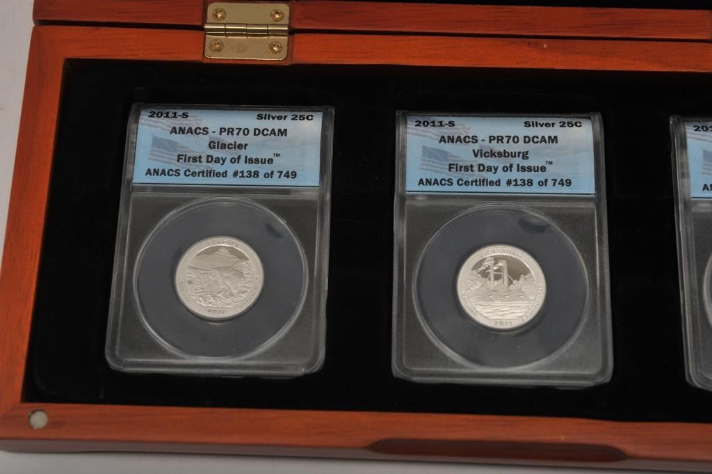 First Commemorative Mint Silver 2011-S US State Parks Quarters. The lot includes five commemorative quarters marked, “First Day of Issue”, ANACS certified #138 of 749. The set includes: Gettysburg, Olympic, Glacier, Vicksburg and Chickasaw. The set comes in a velvet lined wooden display case with a certificate of authenticity. Est.: $100-$200.