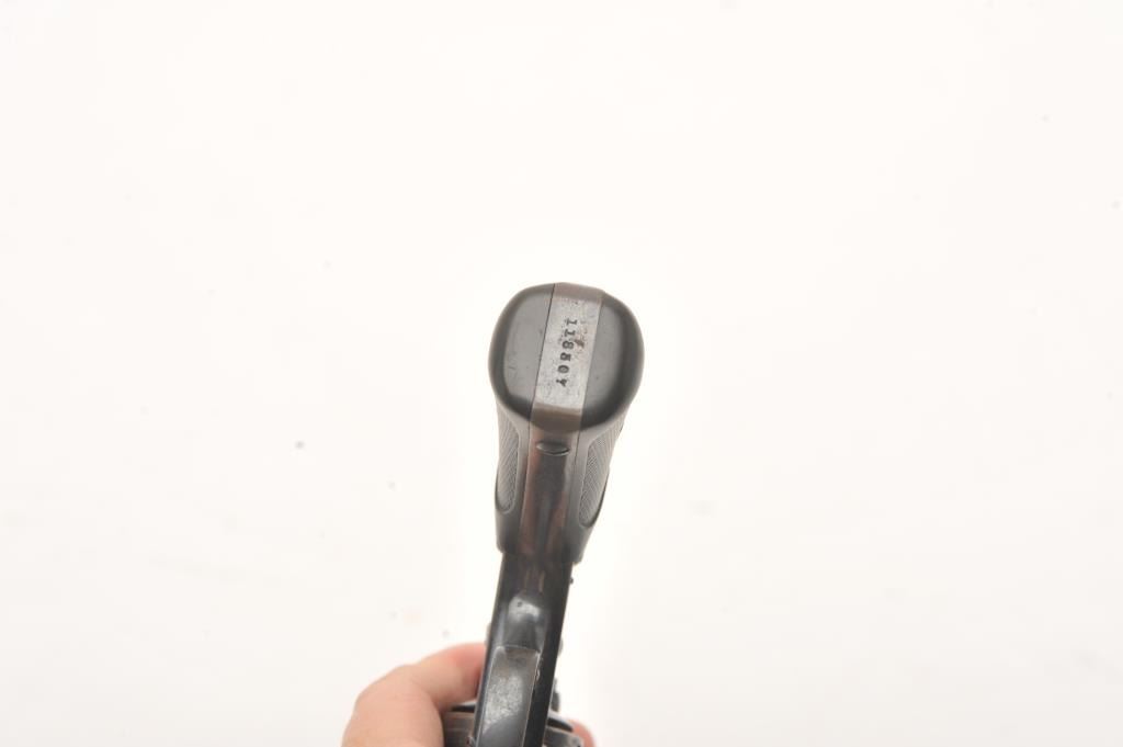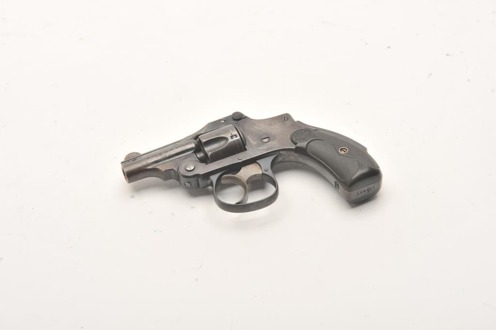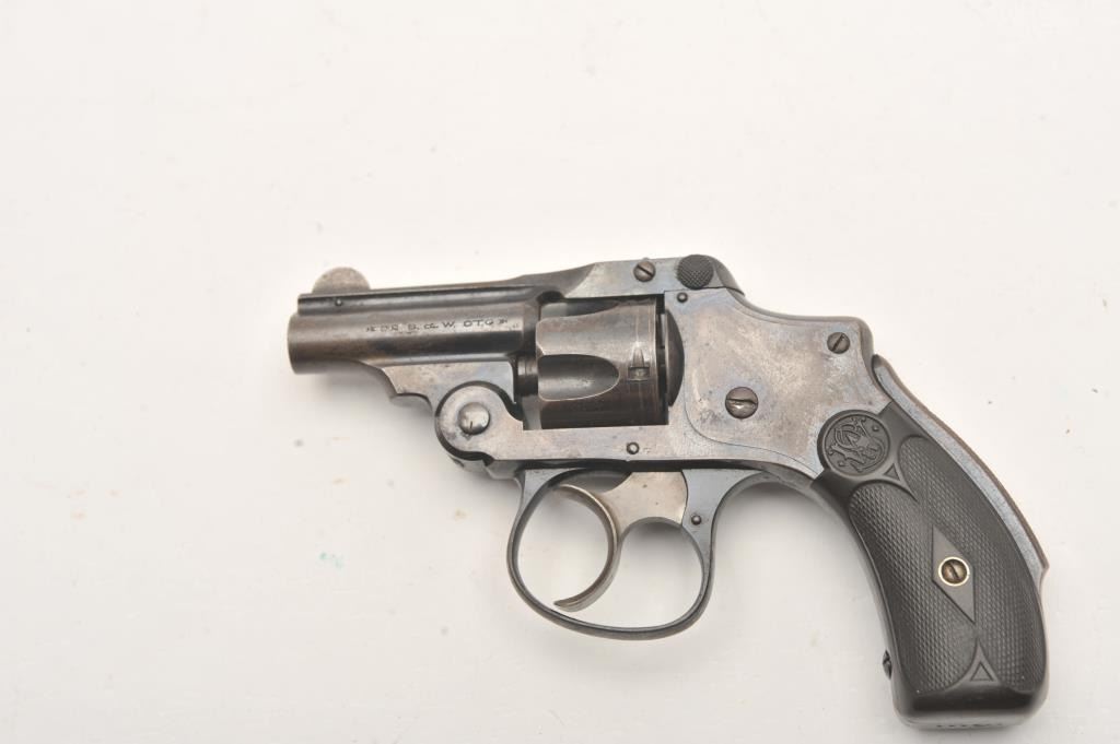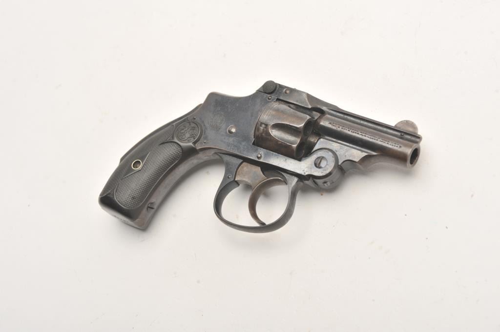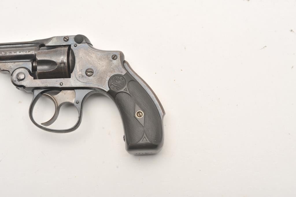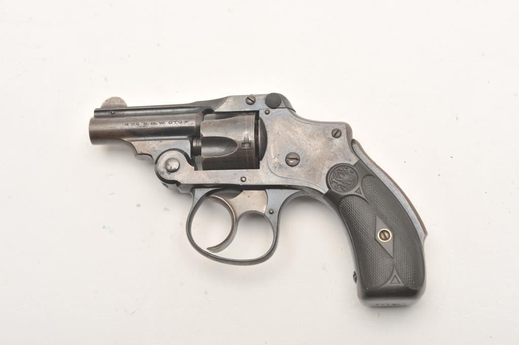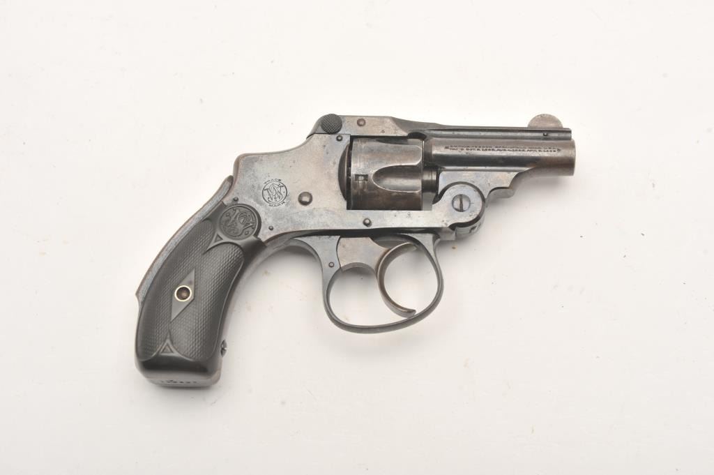 Scarce and desirable ‘Bicycle Model’ Smith and Wesson .32 Second Model Safety D.A. revolver. Rare 2 factory original inch barrel. Frame, barrel, and cylinder retain considerable bright original blue finish. Trigger has some casehardening. Original S&W gutta percha grips are fine with no chips. Action is crisp and bore is fine. Serial number 118307. Nice ‘Bicycle’ S&W. Est: 500-800