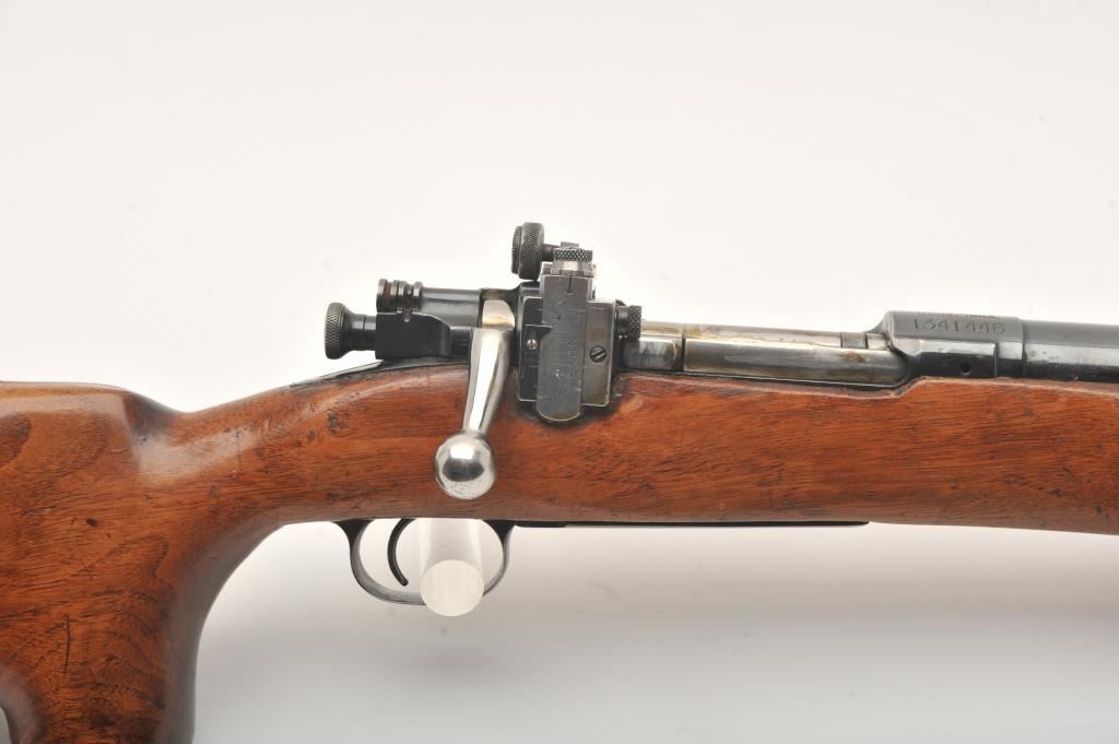 US Springfield Armory Model 1903 bolt action target rifle, .30 caliber, Serial #1341446. The rifle is in good overall condition with a 26”: bull barrel with a hooded globe style front sight. The metal surfaces retain the majority of their polished blue finish with small mars and loss of finish at the muzzle. A period Lyman aperture sight has been added during the period of use. The smooth wood custom target stock is in good condition with mars and scratches consistent with field use. The stock features a beaver tail fore end with an ebony cap and red rubber recoil pad. The bore is good, the action crisp and markings are sharp. Est.: $300-$600. (C+R).