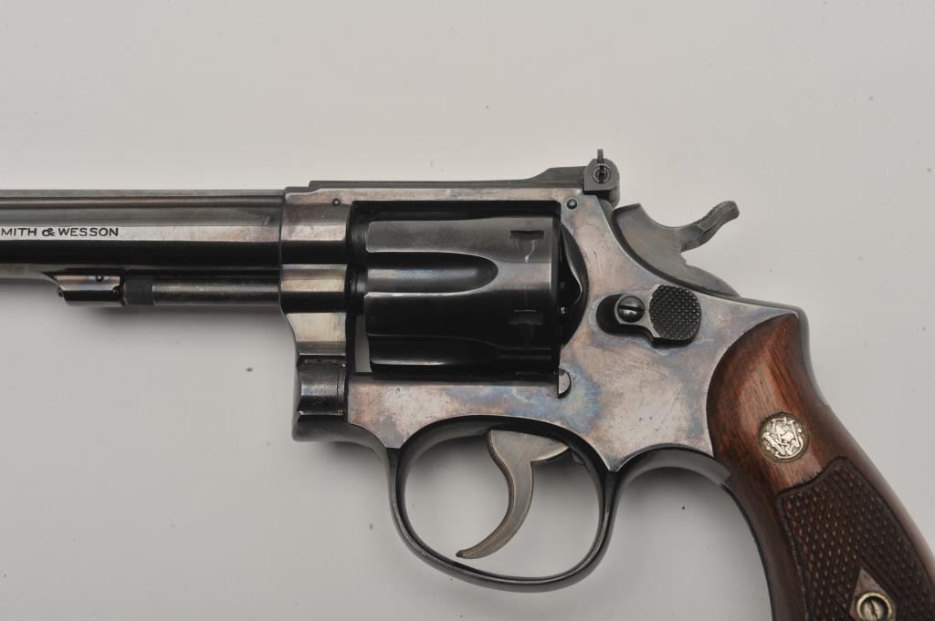 Smith & Wesson pre-Model 17 5-screw DA revolver, .22LR caliber, 6” barrel, blued finish, checkered wood medallion grips, S/N K251149; overall fine condition displaying majority of original finish, fine bore, action, markings and grips. (C&R/PPT). Est.: $400-$800.