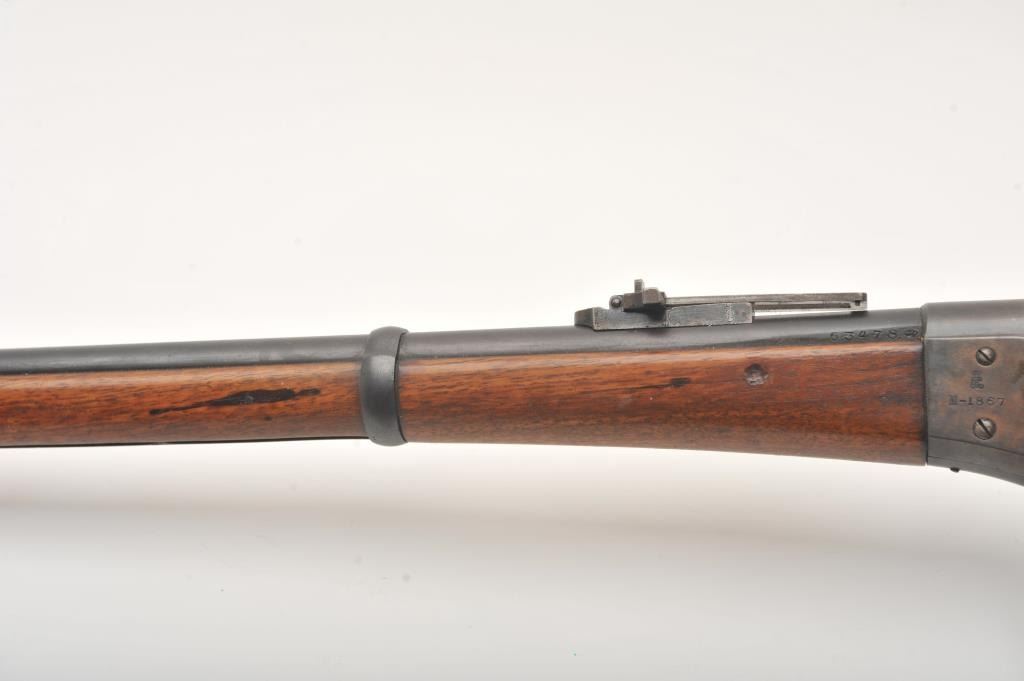 Danish Model 1867 Remington Rolling Block single shot rifle, 11.7 x 42R caliber, 35.5” barrel with side mounted bayonet lug, blued finish, wood stocks, S/N 63478; overall good condition with a good to very good bore, crisp action, sharp markings and overall good wood with later silver wire inlay on left side of butt stock depicting a hunter and Mohawk Indian. (Antique). Est.: $300-$600.