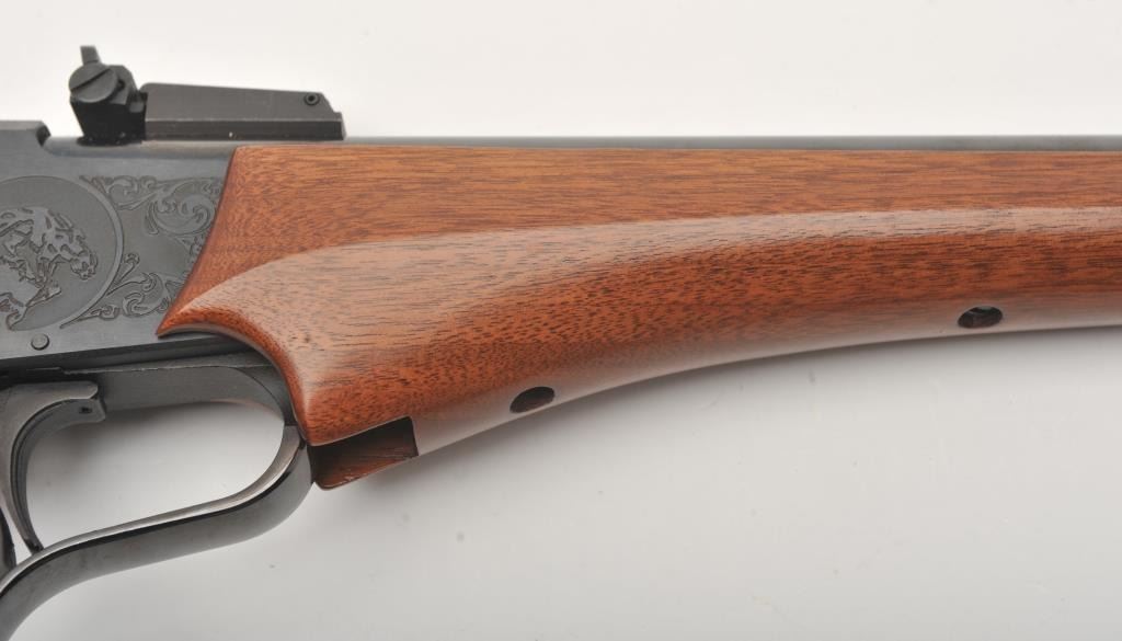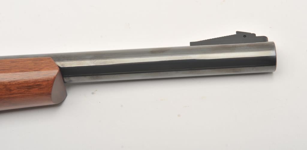 Thompson Center Arms single shot tip-up pistol, Super 14 Model, .223 Rem. caliber, 14” barrel, blued finish, wood grip and fore stock, S/N 255152; overall fine condition with majority of original finish, very good to fine bore, crisp action, sharp markings and fine wood; accompanied by a tan leather holster by Hunter. (Modern/PPT). Est.: $250-$500.