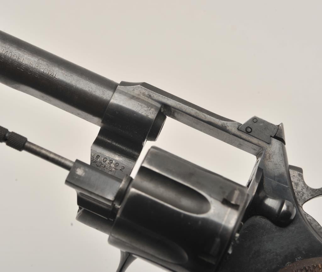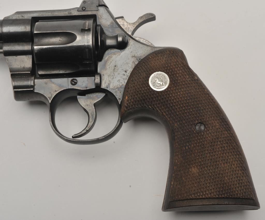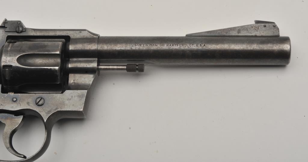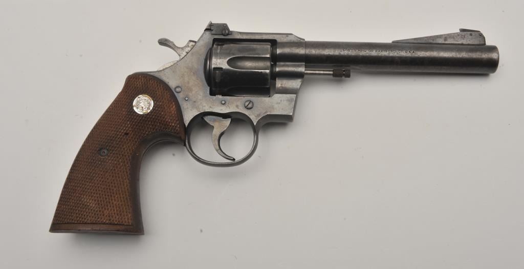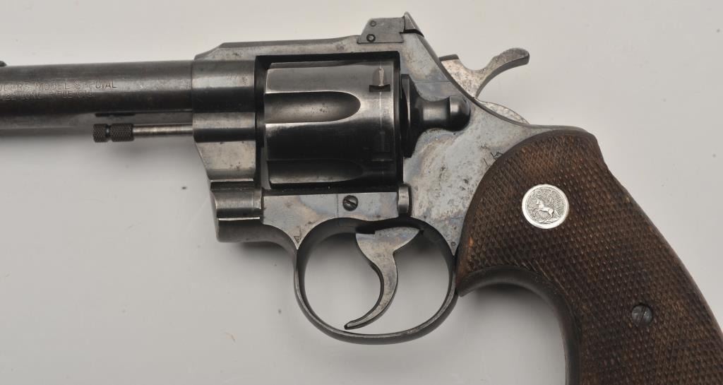 Colt Officer’s Model Special DA revolver, .22LR caliber, 6” heavy barrel, blued finish, checkered wood medallion combat grips, S/N 60992; overall good used condition with scattered light pitting confined mostly to barrel; good bore, action and markings, grips show wear and could use a cleaning but are good overall. (C&R/NO PPT). Est.: $250-$500.