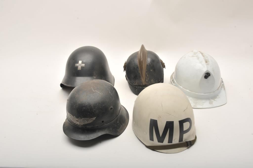 Lot of 5 helmets including: 1. Luftshutz (German WW II-no liner); 2. Italian WW I Cross Medic (w/good liner); 3. MP Camp Pendleton, CA. (Vietnam era) (w/liner); 4. Communications plastic helmet w/liner with Communications Electronics USMC decal and USMC brass insignia, Camp Pendleton, CA; 5. Imperial pre-WW I German Fireman’s helmet, fair to rough condition. Est.: $150-$300.
