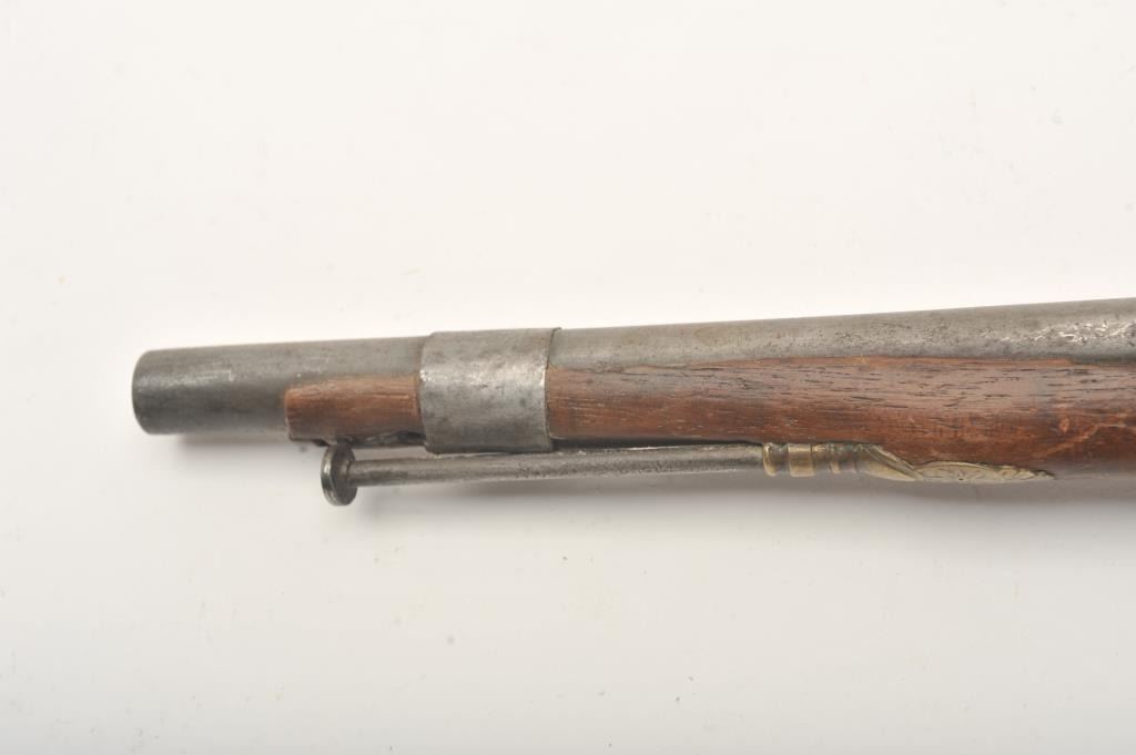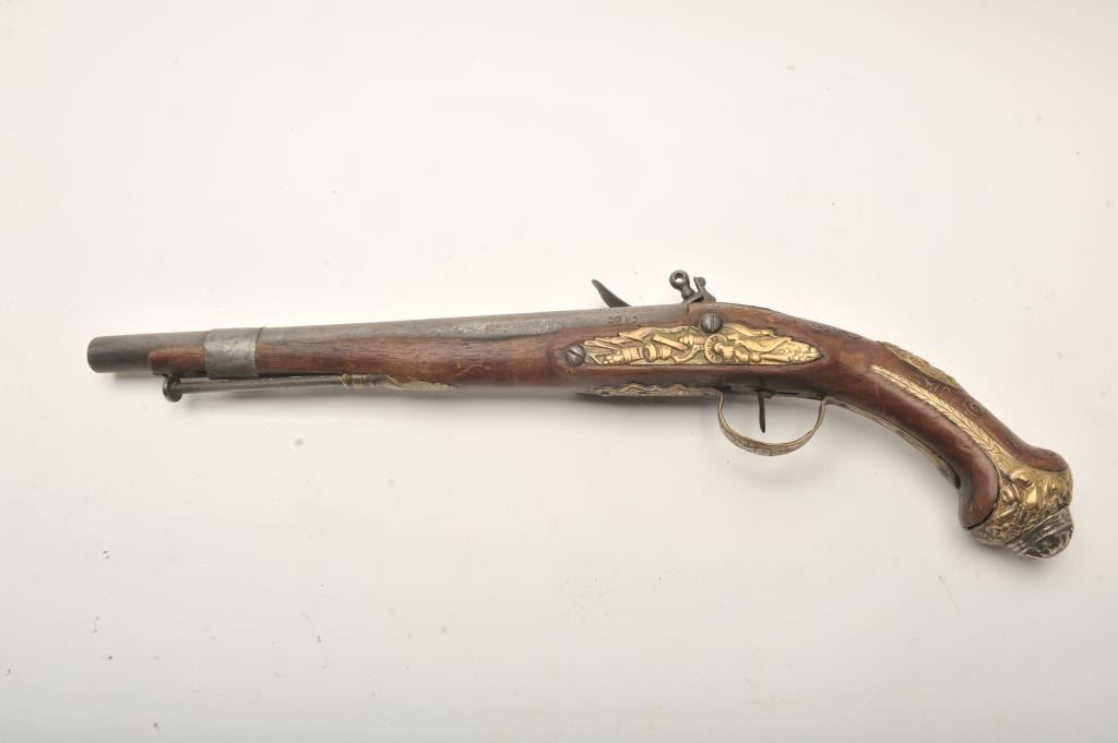 European made flintlock pistol made for Mid-Eastern trade. Fancy brass mounts with silver grip cap. Illegible script signature on lock in scroll. Measures 19” overall with a 12 ¼” barrel of approximately .69 caliber. The stock and fore end has been reduced and crude metal band added during era of use. Overall condition is fair to good with natural aging and imperfections. Lock working. (Antique) Est.: $250-$500