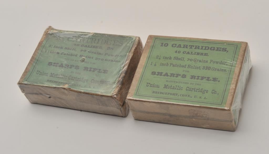 Lot of 2 boxes of cartridges for the Sharps Rifle by Union Metallic Cartridge Co.; one 10 round box in .40-70-330 caliber with green label, the other a 10 round box in .40-90-370 caliber and also with a green label. Est.: $150-$300.