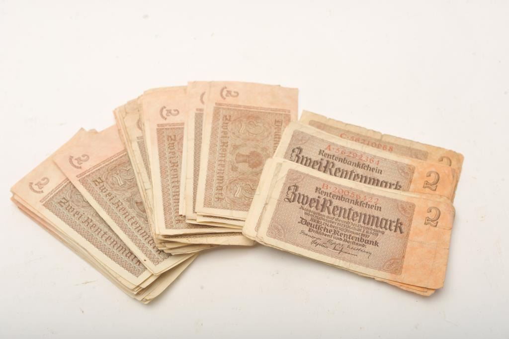 Lot of approximately 100 German Renten Mark banknotes dated 1937. Condition varies and several notes have sequential numbers. Est.: $50-$100.