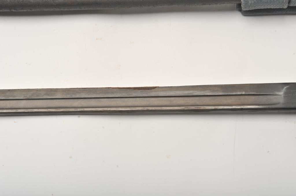 Remington marked Enfield P-17 bayonet with scabbard and frog. The bayonet is in good overall condition with an overall length of 22” and a 17” blade. The blade is marked Remington at the base and dated 1913. There are numerous proofs including the English Broad Arrow mark. The wood handle is in good condition and the serial # 321 is stamped on the pommel. The lot includes a period leather scabbard and grey canvas frog. Est.: $100-$200.