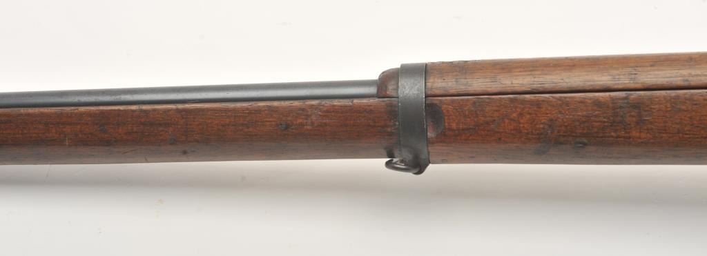 Arisaka Type 38 bolt action rifle, 6.5 mm caliber, Serial #77060. The rifle is in very good condition with a 32” barrel with a protected blade front and military tangent style rear sights. The metal surfaces retain the majority of their military finish with a crisp Mum on the front ring and the dust cover is intact. The smooth wood stock is in good condition showing moderate to heavy wear with mars and compressions consistent with service use. The rear sight shows what appears to be a bullet strike and a piece of the jacket fell off when the consignor brought it in. The bore is fair, the action is crisp and markings are sharp on this desirable Arisaka. Est.: $150-$300. (C+R).