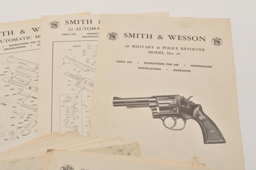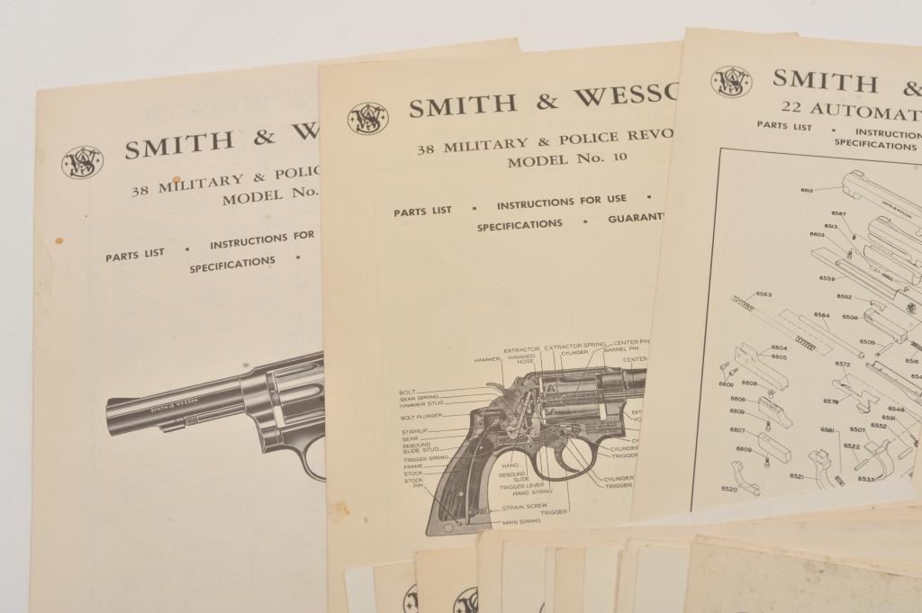 Lot of 38 Smith & Wesson original instructions/parts/maintenance sheets including Models 10, 46, 12, 14, 16, 19, 25, 27, 28, 29, 30, 31, 32, 34, 36, 37, 38, 39, 40, 41, 48, 49, 53, 57, 58, 59 and 469; some duplicates. Est.: $100-$150.