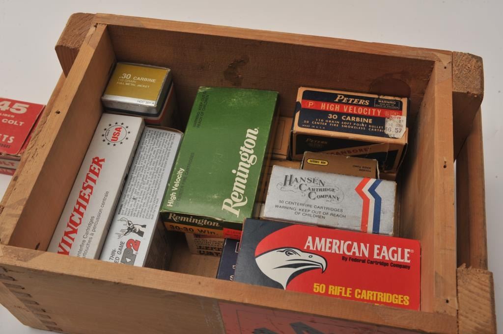 Lot of 14 misc. boxes of ammunition, various makers with some additional shell cases, various calibers including .30 carbine, .38-40 Winchester, .30-30, 32 S&W, .45 auto, etc.; mostly full boxes; all contained in a wooden ammo crate. Est.: $75-150.