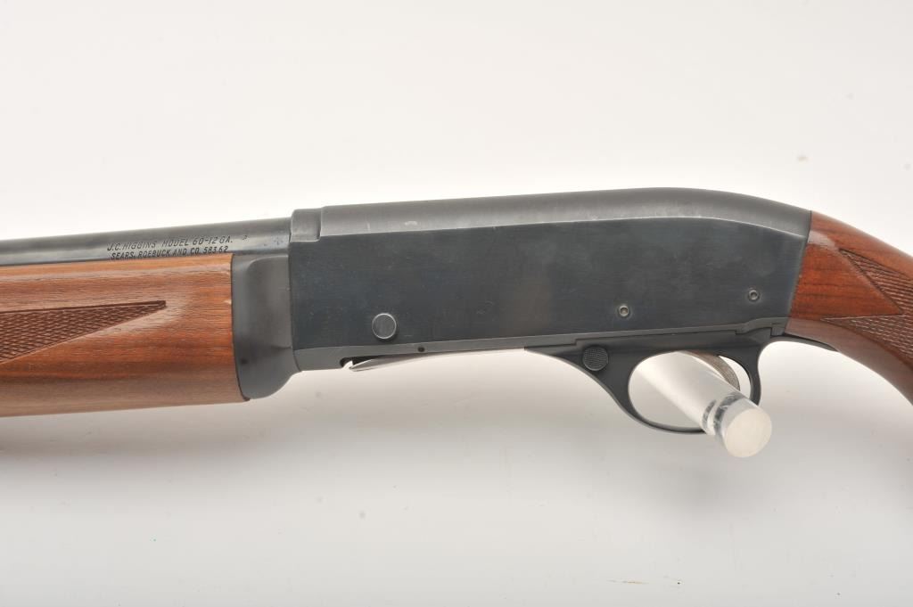 J.C. Higgins Model 60, #NSNV, 12 Ga., 28" barrel, blued finish, checkered walnut stock with plastic butt plate. Shotgun is in very good condition overall, showing some mars and dings from storage and use. Bore is good, action is good. (C&R/PPT) Est. $80-160