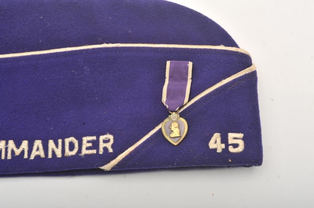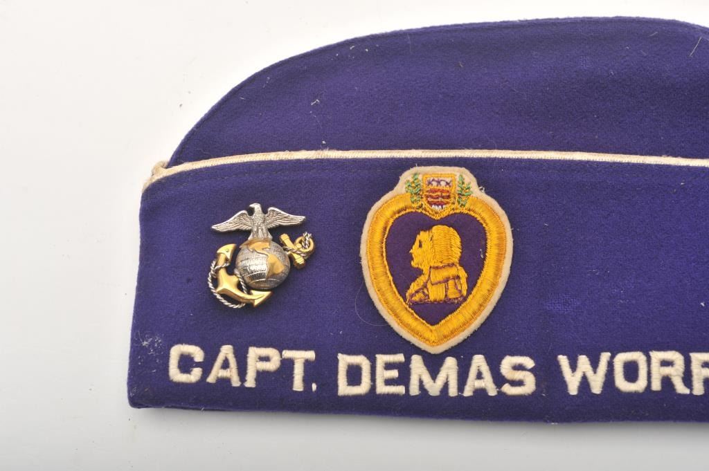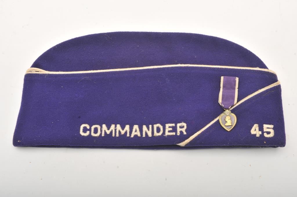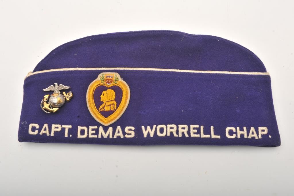VFW Commander cap with USMC Emblem and Purple Heart medal/ribbon belonging to Capt. Demas Worrell, Chaplain USMC – served in WW II; a very famous and significant individual. Est.: $50-$100.