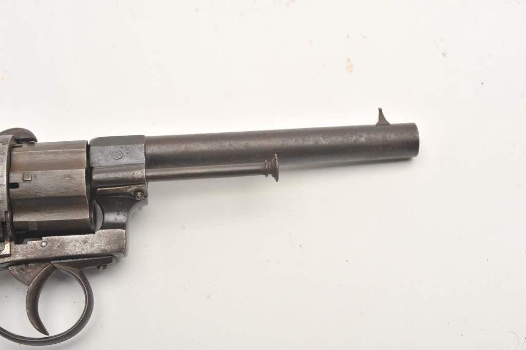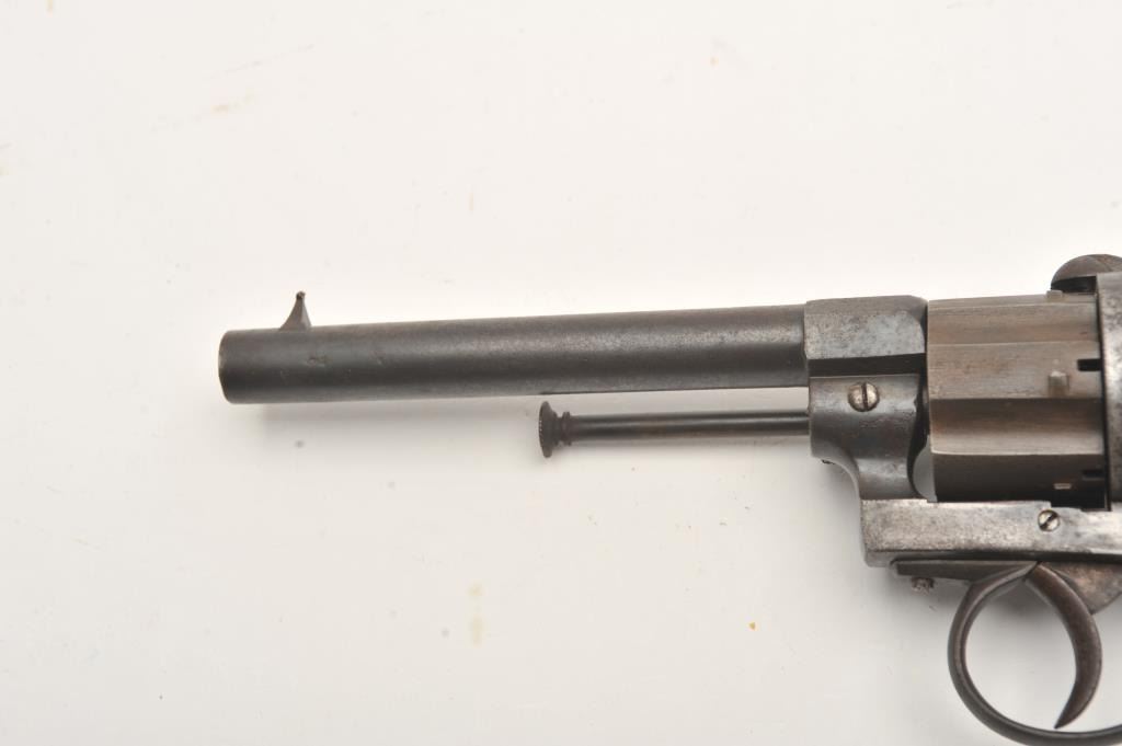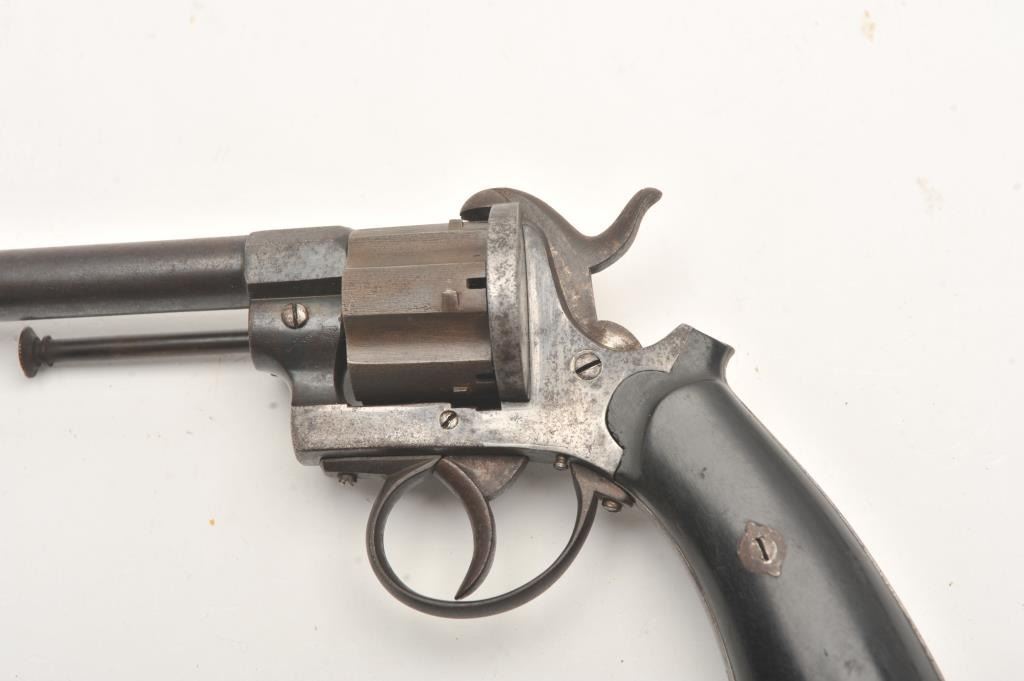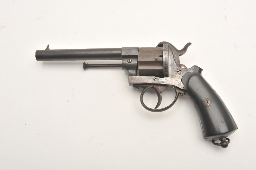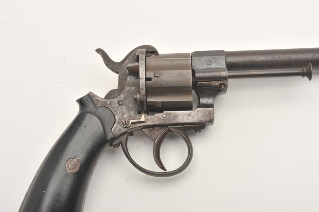 Double action pinfire pistol in 11mm with 5 ½” barrel and unmarked. Shows Belgium proofs. Good condition with 30%-50% blue turning brown. The stocks are a select dark wood and at least good condition. The action works well and tight. All small parts retained. (Antique) Est.: $250-$500