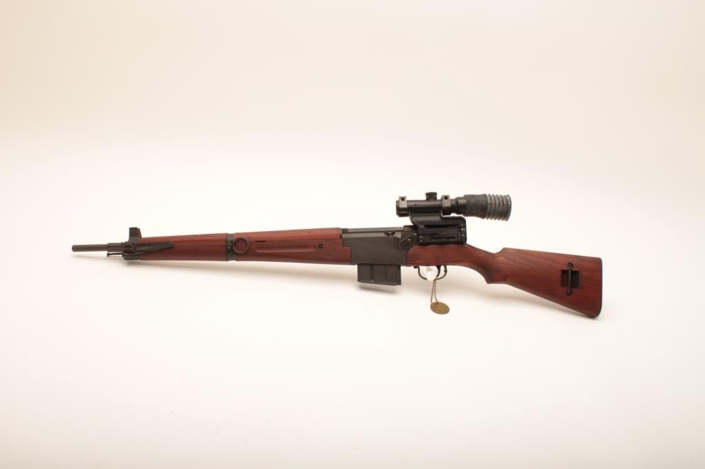 French MAS semi-automatic Model 1949 rifle, 7.5mm caliber, 23” barrel, military finish, wood stock, S/N F 58033; mounted with an APX scope displaying sharp optics; majority of military parkerized finish remains on metal surfaces, crisp action, sharp markings and very good + wood; bore is dark and needs cleaning. (C&R). Est.: $1,000-$2,000.