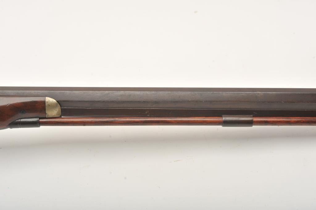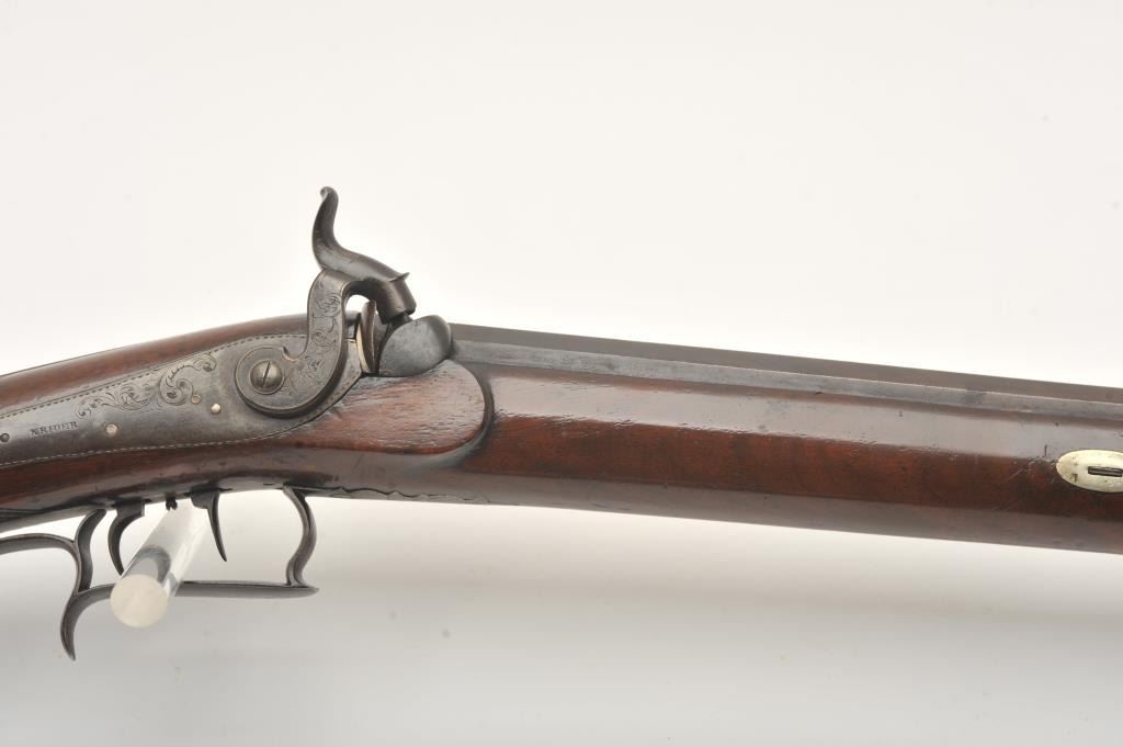 Percussion half stocked plains rifle by Krider of Philadelphia, .44 caliber, 36.5” barrel, brown finish, double set triggers (working at time of description), checkered wood stock; overall very good condition with pleasing brown patina to metal surfaces, engraved lockplate, hammerand iron patchbox; crisp action, sharp maker markings on barrel and lockplate; good stock. (Antique). Est.: $700-$1,400.