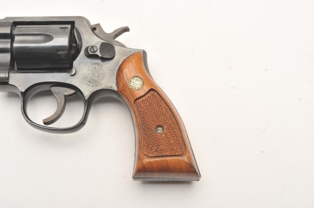 Smith & Wesson 10-8, #19D0033, .38 Spl cal., 4" heavy barrel., fixed sights, blued finish, checkered medallion grips. Revolver is in very good to near fine condition overall, slight holster wear, very good bore, good grips, good action. Includes Bianchi leather basket weave holster and "Sam Brown" belt, size 40 with handcuff case. (Modern/PPT) Est. $300-600