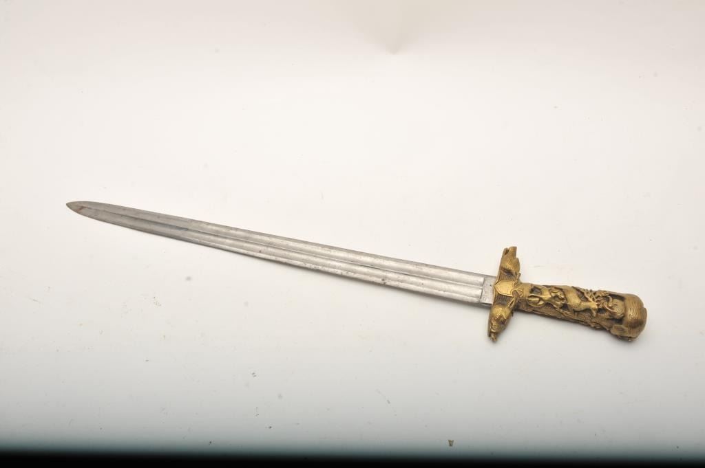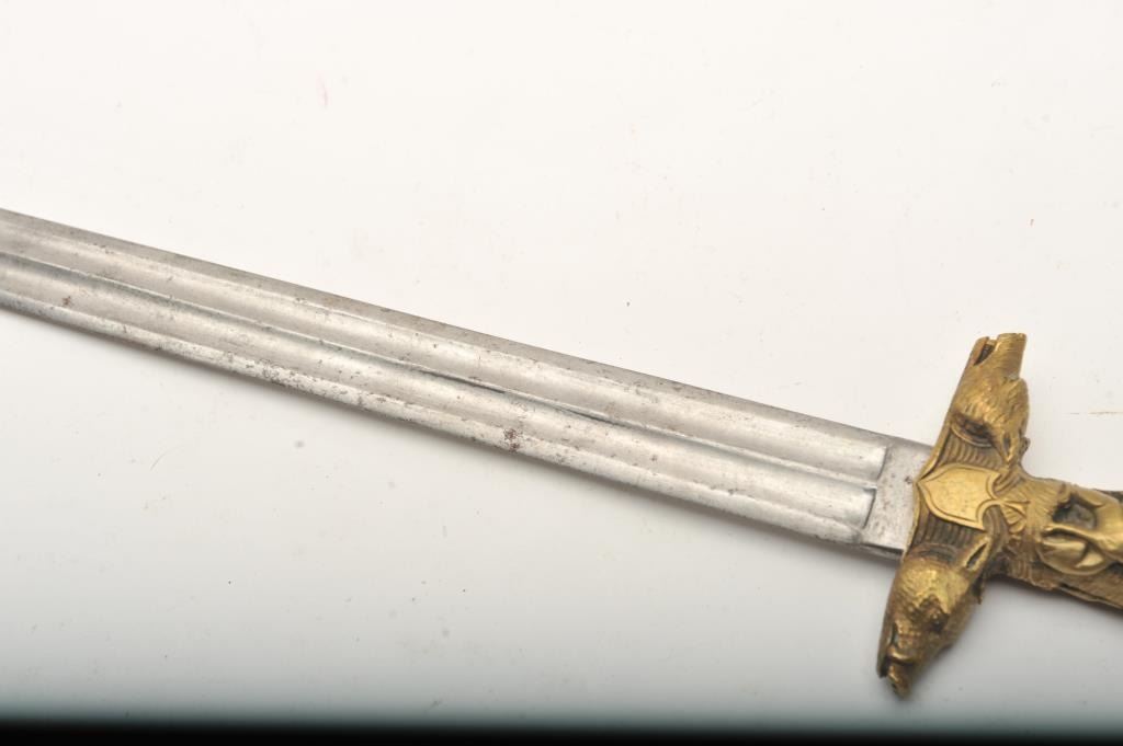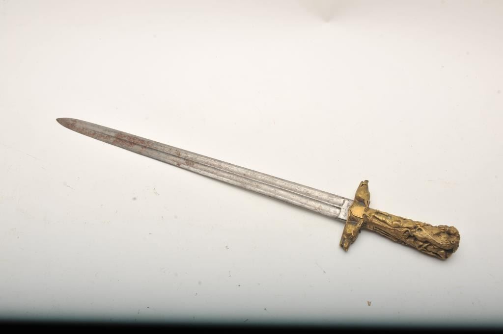 19th century hunting sword with heavy cast bronze grip showing ornate and detailed hunting scenes. Fluted and ribbed blade of 20” and 25” overall. Very good to almost fine condition. No scabbard. Est.: $600-$1200