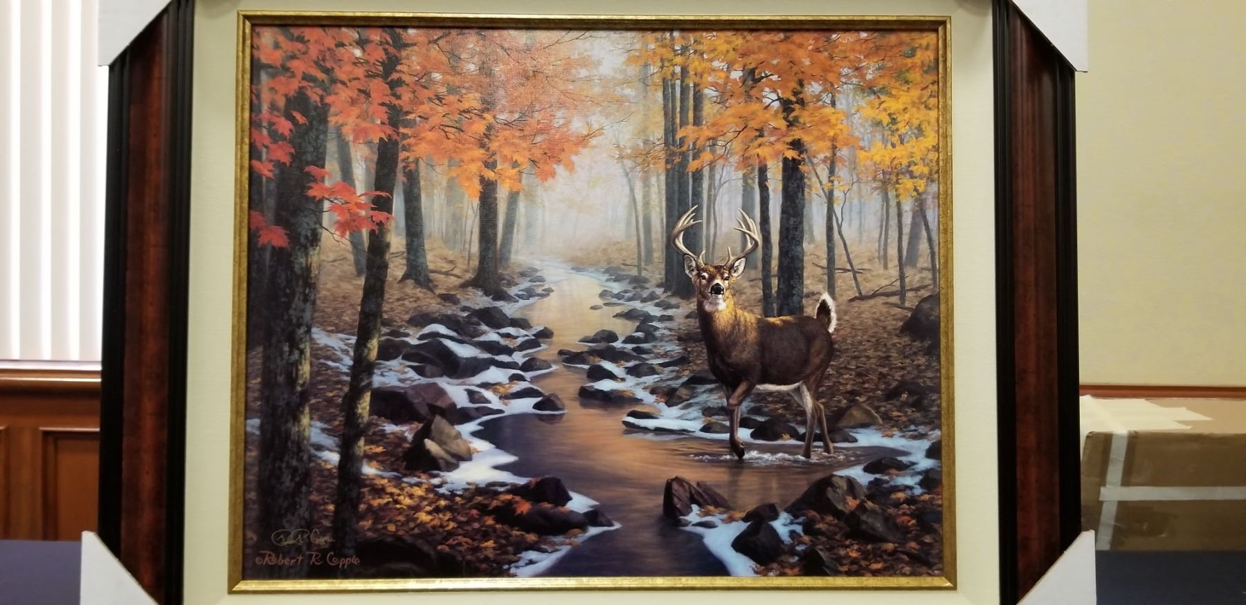 This beautiful framed piece measures 24 ”x 40 ” and is ready to hand in your trophy room, den or office. The artwork features a majestic Trophy White Tail Deer in a beautiful autumn setting.