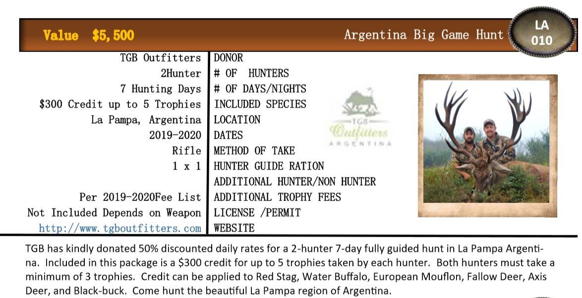 Argentina is known worldwide as a real paradise for big game hunting. TGB Outfitters has kindly donated a 2 hunter 7 day fully guided hunt in La Pampa Argentina. Included in this package is $300 credit each for up to 5 trophies for each hunter. Credit can be applied to Red Stag, Water Buffalo, European Mouflon, Fallow Deer, Axis Deer and Blackbuck. Winning Bidder is required to bring 1 extra hunter at full price of $3150 Each Hunter must take 3 Trophies. Hunt includes daily rates for 1 hunter for 7 days and includes a $300 credit for each of up to 5 trophies. Hunt is good for the 2019 and 2020 season only. Package does not include local license or permits. https://tgboutfitters.com/