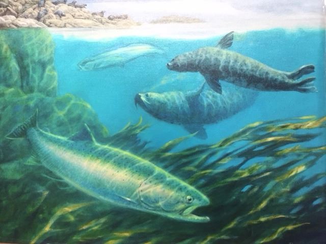 "Seals Their Fate" by artist Bruce Muir. It is an original of seals chasing salmon.