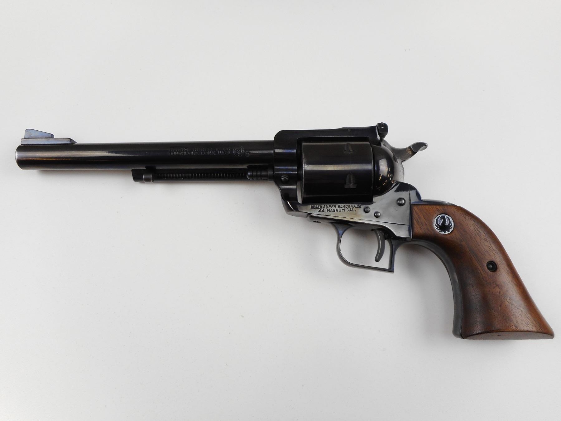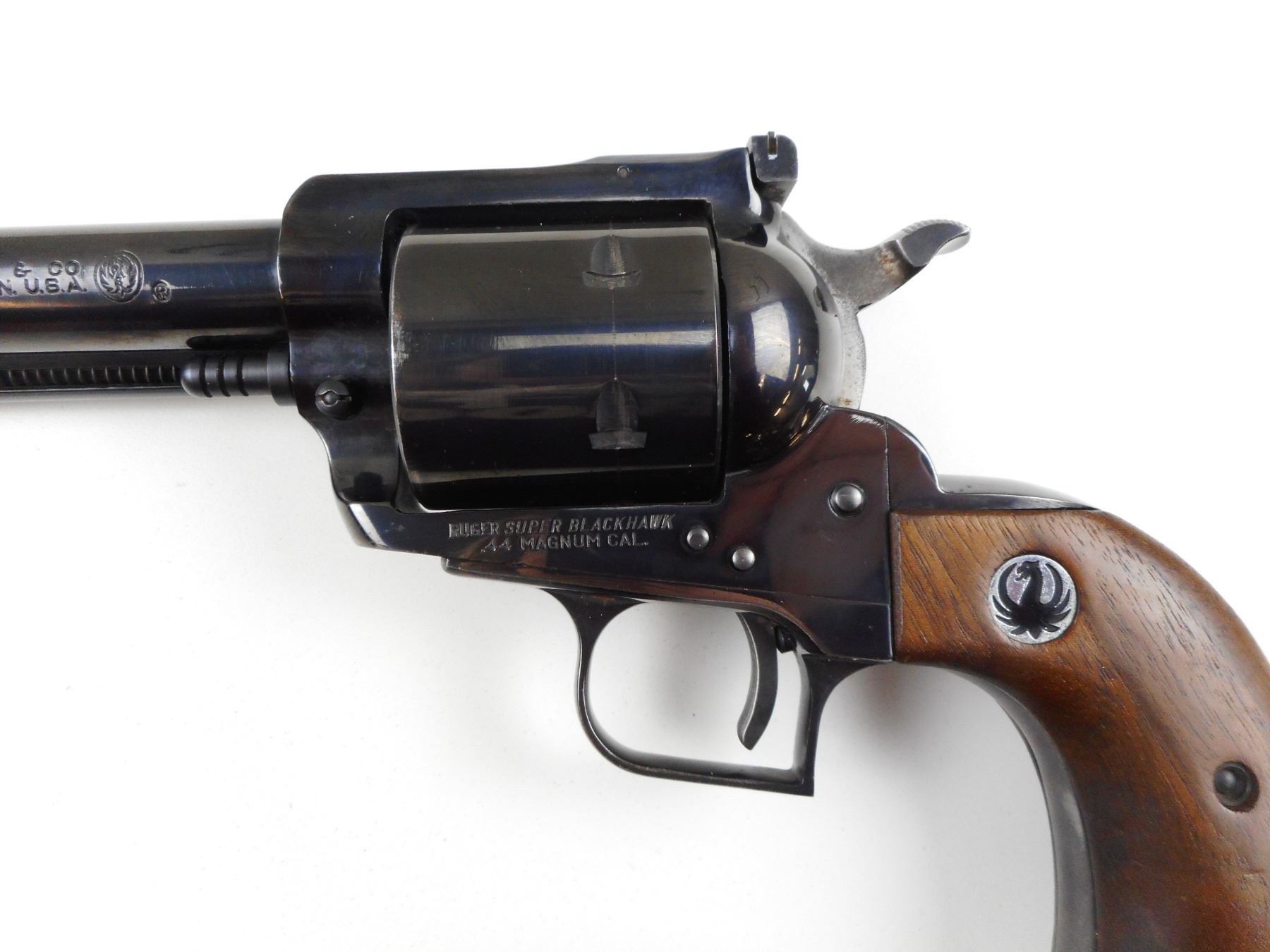 RUGER , MODEL: SUPER BLACKHAWK , CALIBER: 44 MAG , 6 SHOT CAPACITY, HOLDS COCK, INDEXES WELL, ACTION IS TIGHT, RAMP FRONT AND ADJUSTABLE REAR SIGHTS, PLAIN WOOD GRIP PANELS WITH RUGER LOGO, VERY GOOD BORE, SHOWS VERY LITTLE HANDLING MARKS , SERIAL # 8006427 , STOCK # 4118 , ACTION: REVOLVER , BARREL LENGTH: 191MM , CONDITION: 8/10 , CLASS: CANADIAN RESTRICTED CLASS