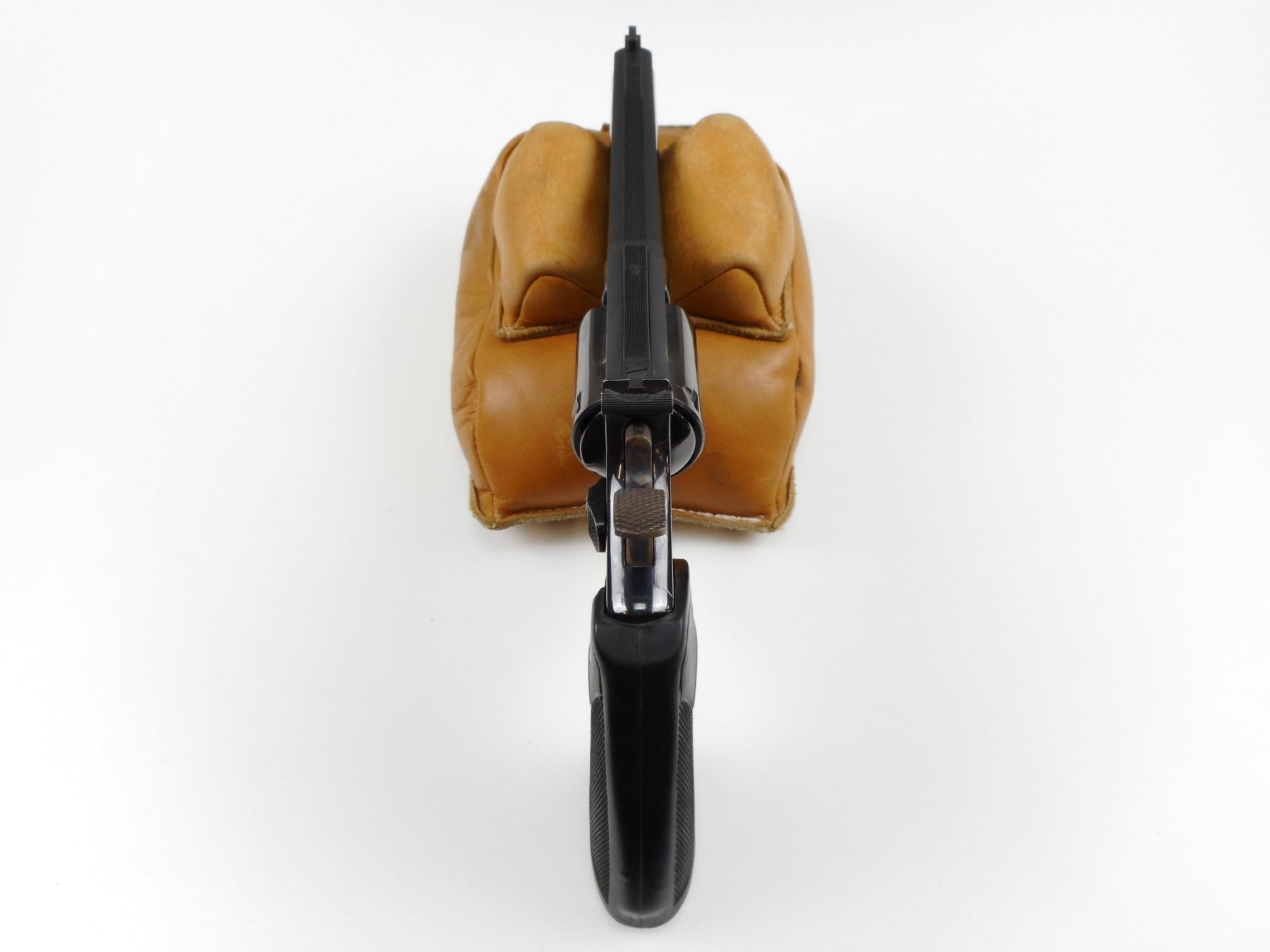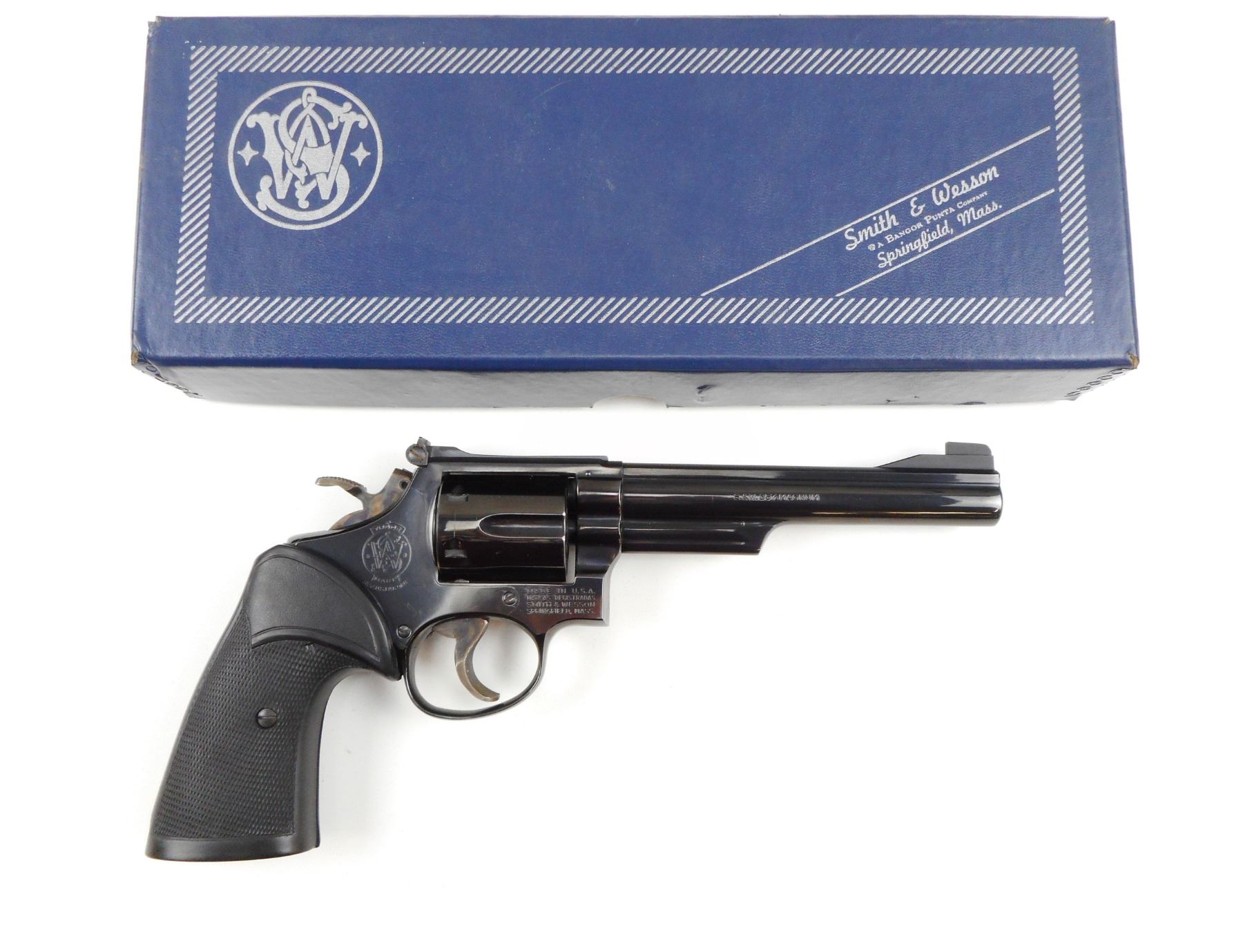 SMITH & WESSON , MODEL: 19 , CALIBER: 357 MAG , COMES WITH ORIGINAL BOX, 6 SHOT CAPACITY, HOLDS COCK, INDEXES WELL, ACTION IS TIGHT, BLADE FRONT AND ADJUSTABLE REAR SIGHT, CASE HARDENED HAMMER AND TRIGGER, PACHMAYER GRIPS, SHOWS VERY LITTLE HANDLING MARKS, VERY GOOD BORE , SERIAL # 9K14658 , STOCK # 4122 , ACTION: REVOLVER , BARREL LENGTH: 152MM , CONDITION: 8/10 , CLASS: CANADIAN RESTRICTED CLASS