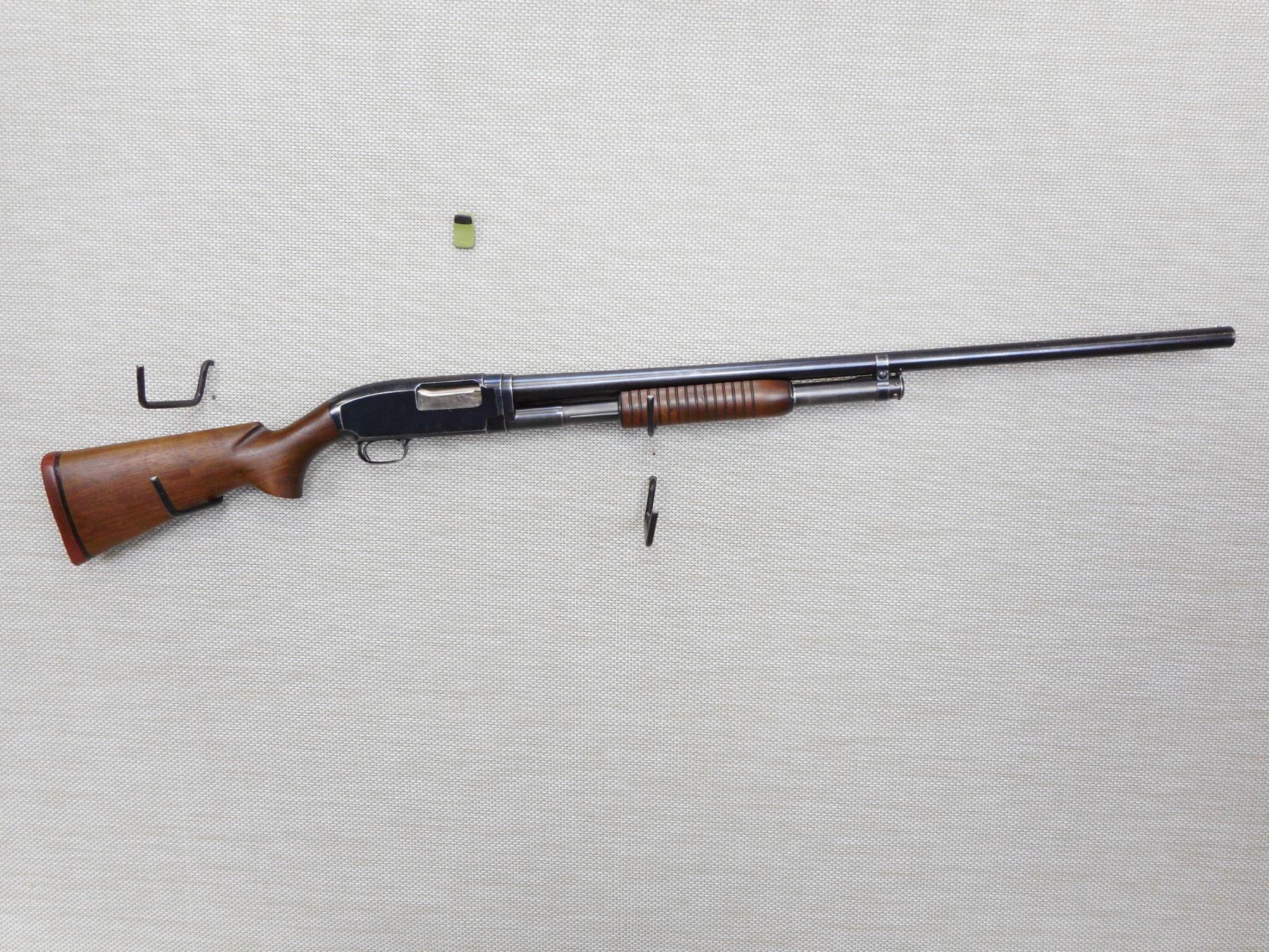 WINCHESTER , MODEL: 12 (HEAVY DUCK) , CALIBER: 12GA X 3" , MANUFACTURED IN 1955, FIXED FULL CHOKE, BORE IS VERY GOOD, BEAD FRONT SIGHT, TWO PIECE HARDWOOD STOCK WITH RUBBER RECOIL PAD, SHOWS SOME HANDLING MARKS, HAS SOME CRACTHES ON BLUEING ON THE RECEIVER , STOCK # 9705 , SERIAL # 1563098 , ACTION: PUMP ACTION SHOTGUN , BARREL LENGTH: 30" , CONDITION: 6/10 , CLASS: CLASS: CANADIAN NON RESTRICTED CLASS