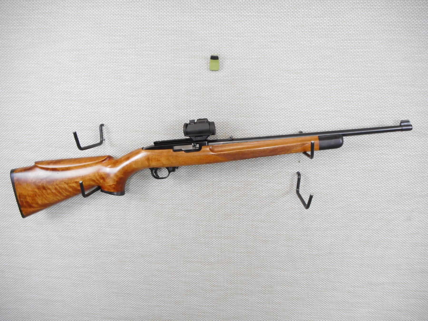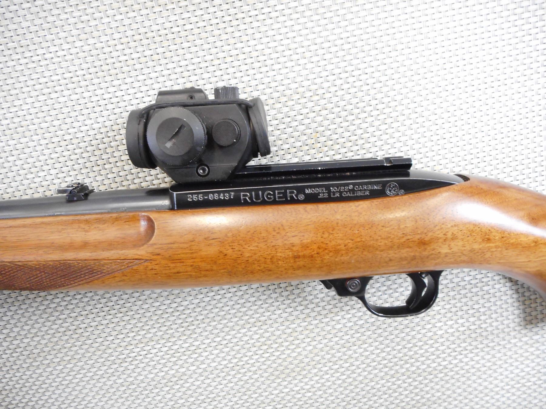 RUGER , MODEL: 10-22 , CALIBER: 22 LR , COMES WITH MAGAZINE, EXCELLENT BORE, BLADE FRONT AND ADJUSTABLE REAR SIGHT, RED DOT SCOPE, CUSTOM CHECKERED WOOD STOCK WITH CAPPED PISTOL GRIP AND RAISED CHEEK PIECE, WOOD BUTT PLATE, SHOWS VERY LITTLE HANDLING MARKS , STOCK # 10140 , SERIAL # 25508437 , ACTION: SEMI AUTOMATIC RIFLE , BARREL LENGTH: 19" , CONDITION: 7/10 , CLASS: CLASS: CANADIAN NON RESTRICTED CLASS