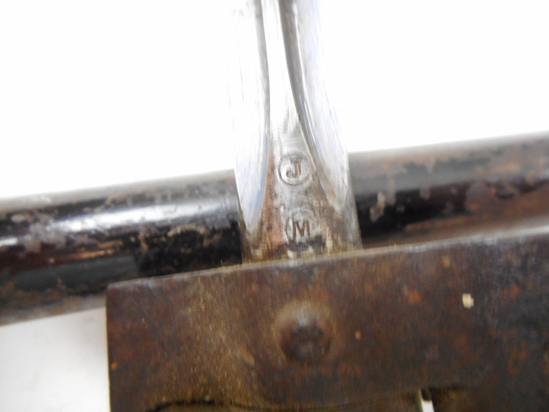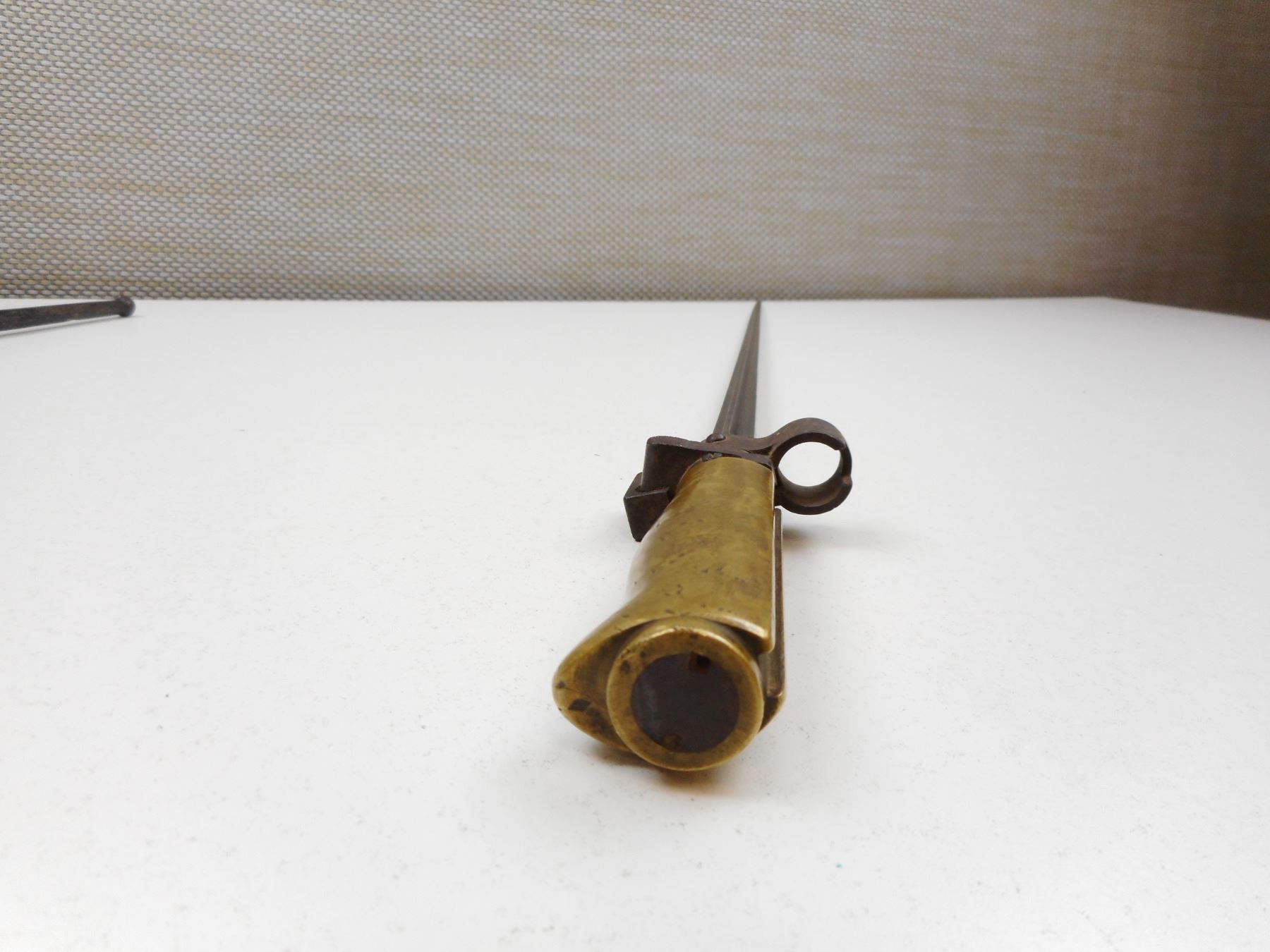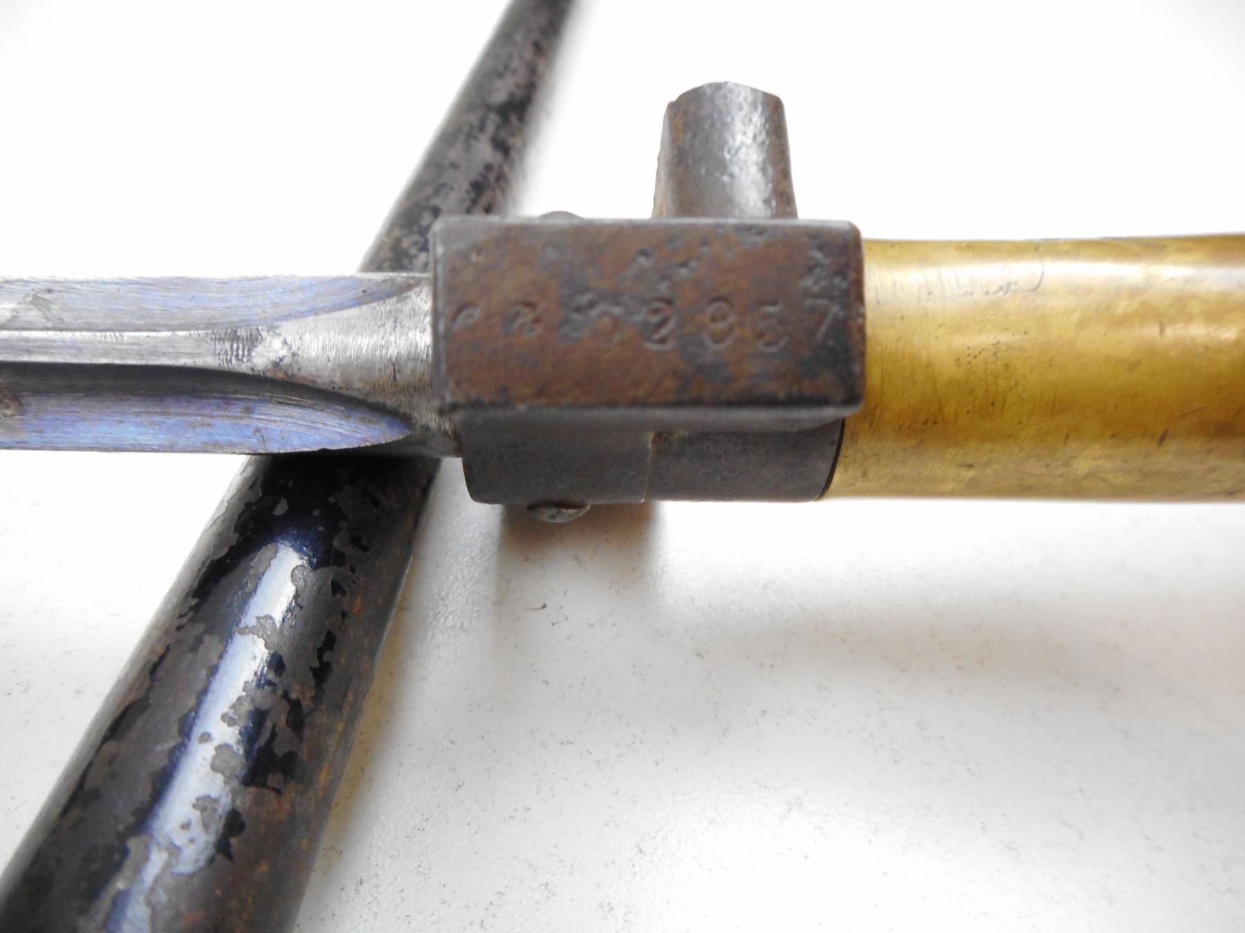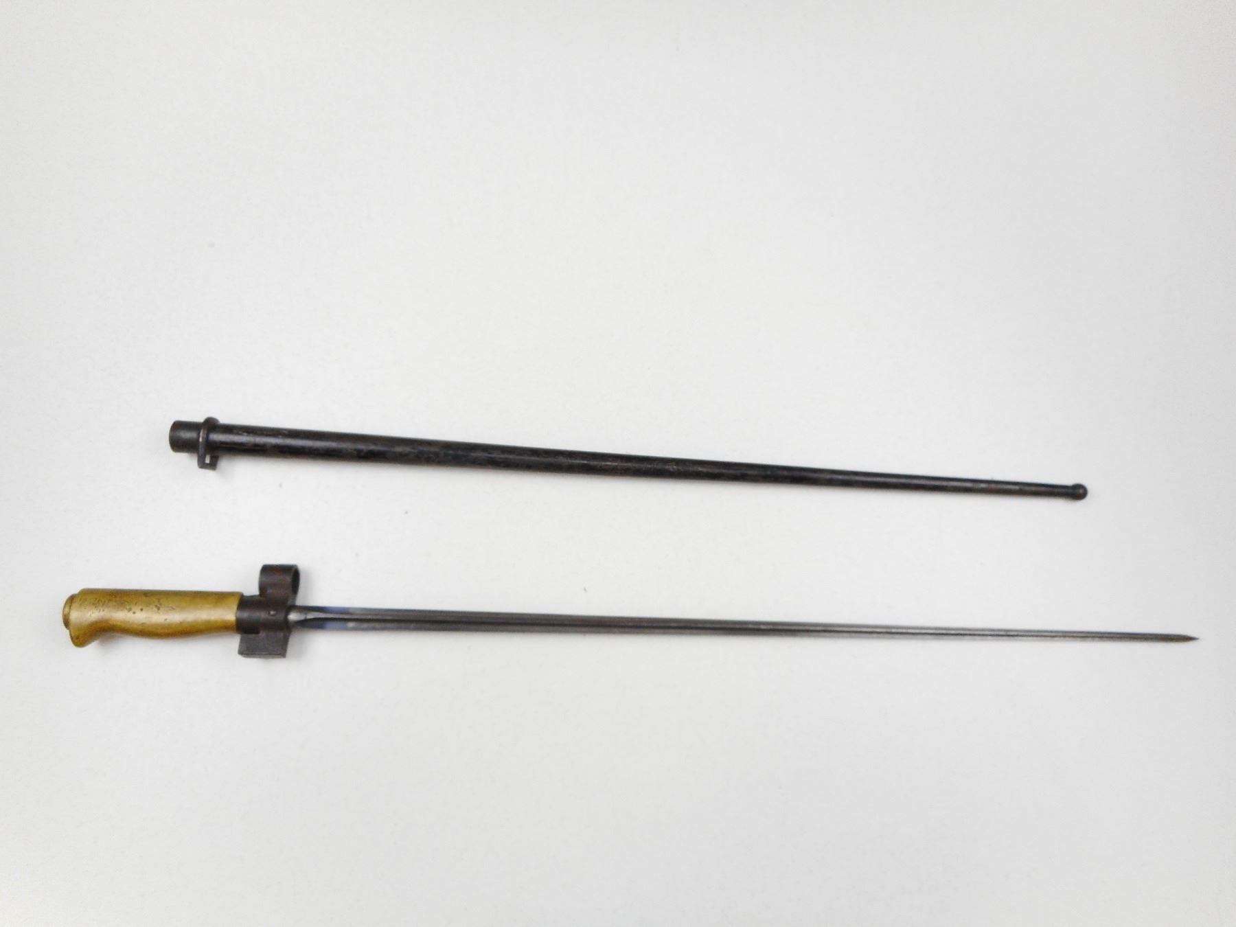 FRENCH SPIKE BAYONET WITH SCABBARD , BRASS HANDLED WITH PARTAIL SERIAL NUMBER ON SOCKET WITH METAL SCABBARD