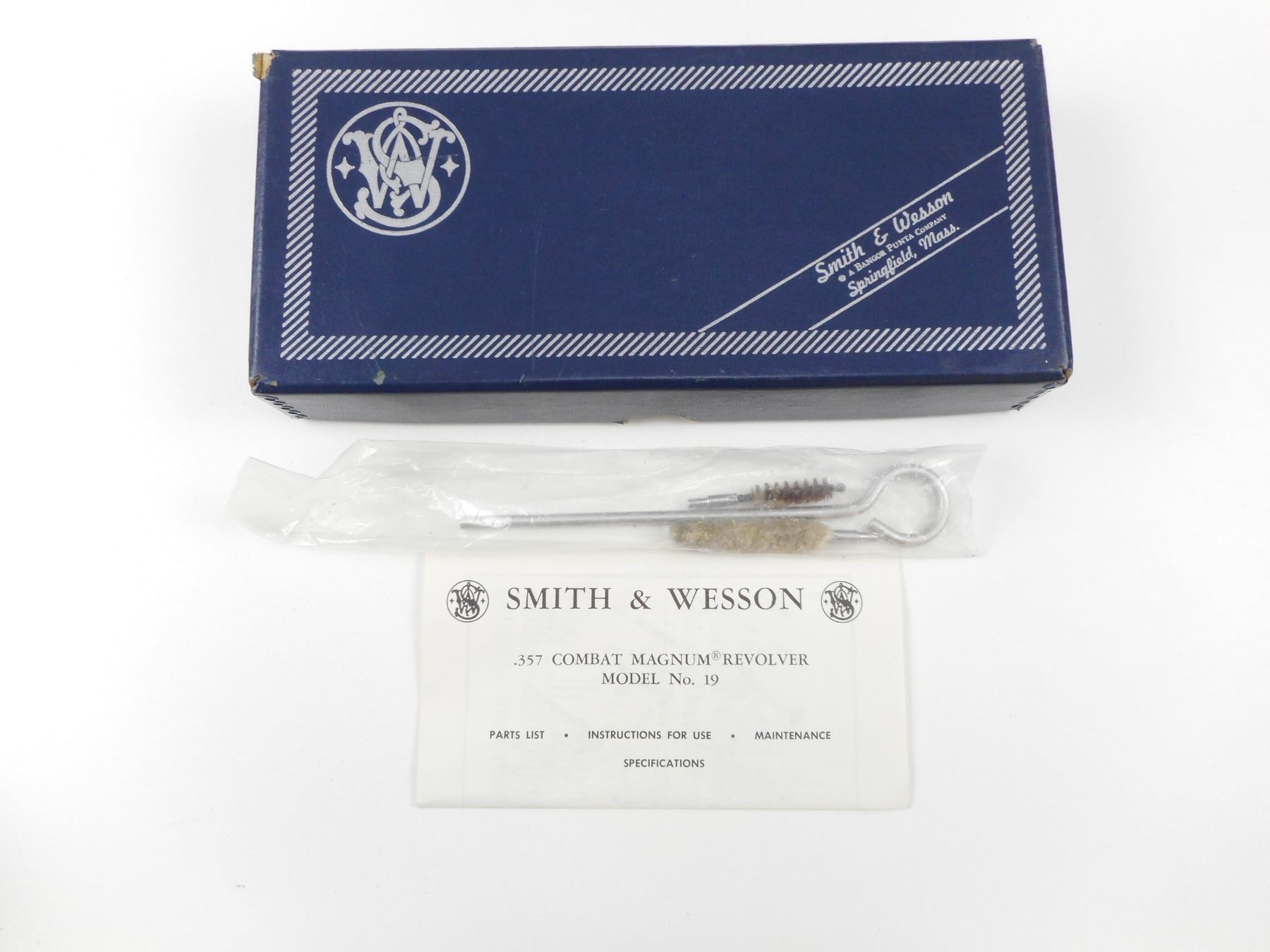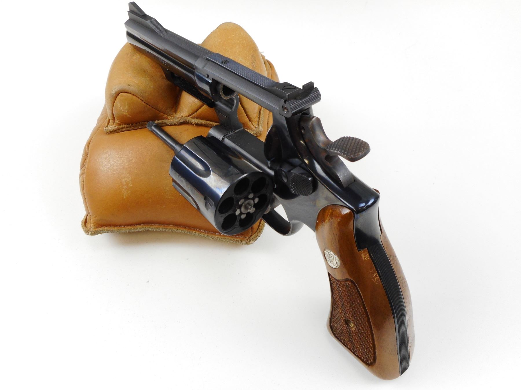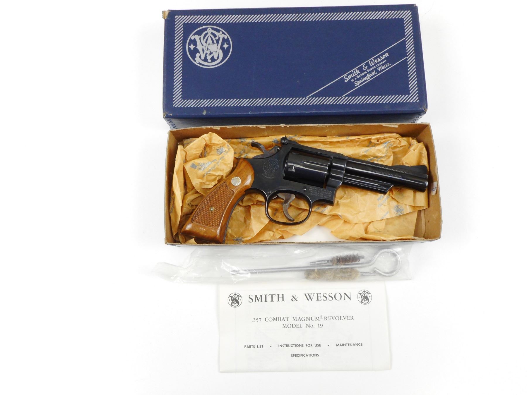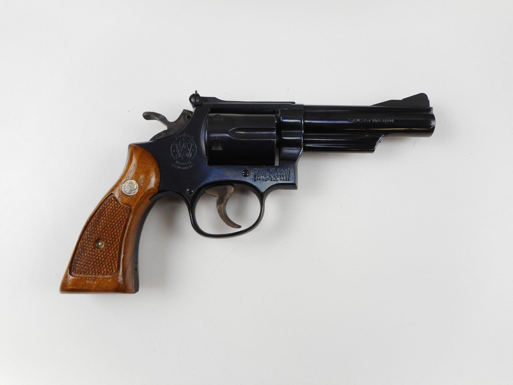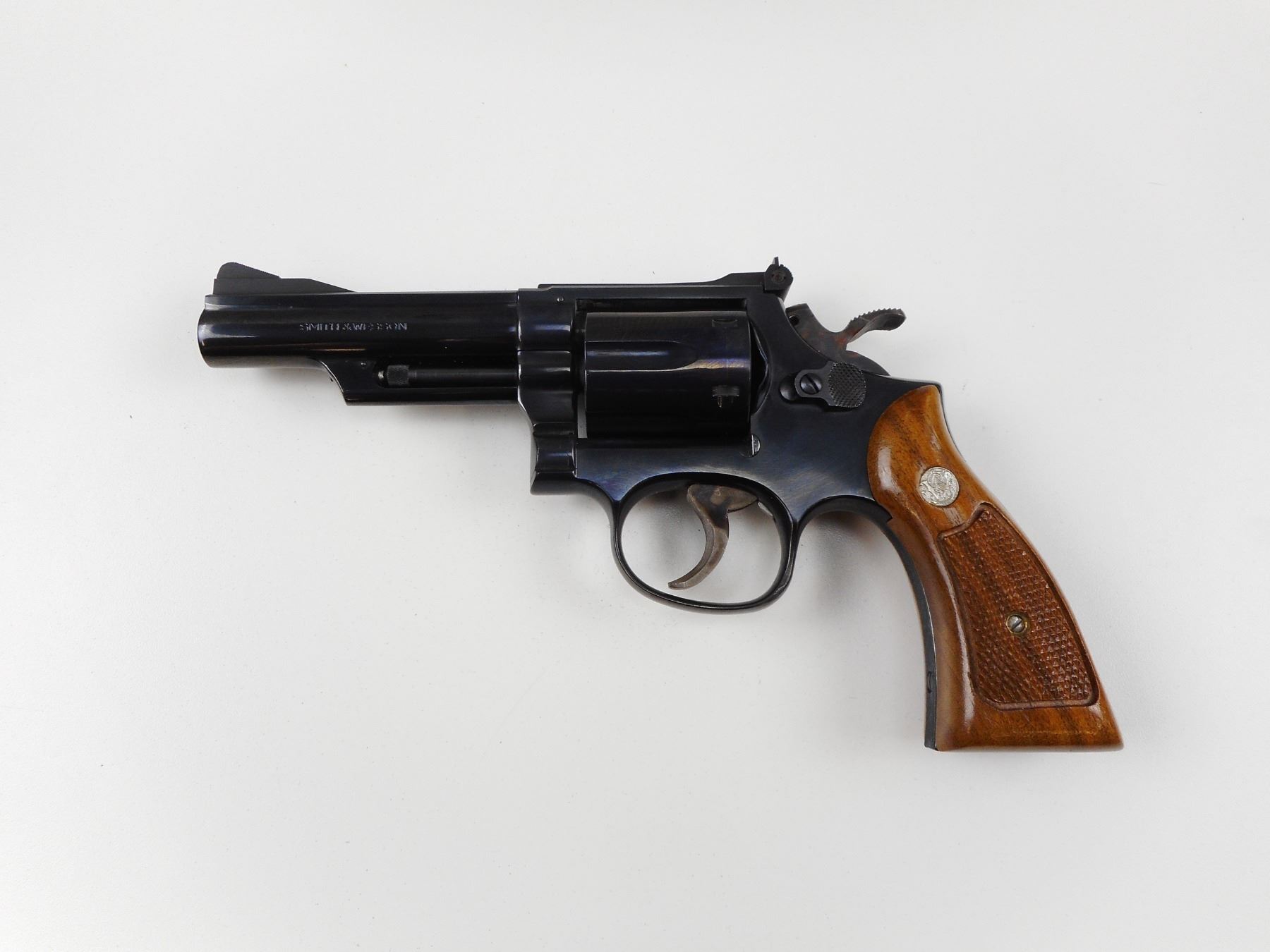 SMITH & WESSON , MODEL: 19-4 , CALIBER: 357 MAG , COMES WITH ORIGINAL BOX AND MANUAL, BORE IS EXCELLENT, RAMP FRONT AND ADJUSTABLE REAR SIGHTS, CHECKERED WOOD GRIP PANELS WITH S&W LOGO, HOLDS COCK, INDEXES WELL, ACTION IS TIGHT, SHOWS VERY LITTLE HANDLING MARKS , ACTION: REVOLVER , BARREL LENGTH: 102MM , CONDITION: 8/10 , STOCK# 2475 , SERIAL # 59K1289 , CLASS: CANADIAN PROHIBITED CLASS