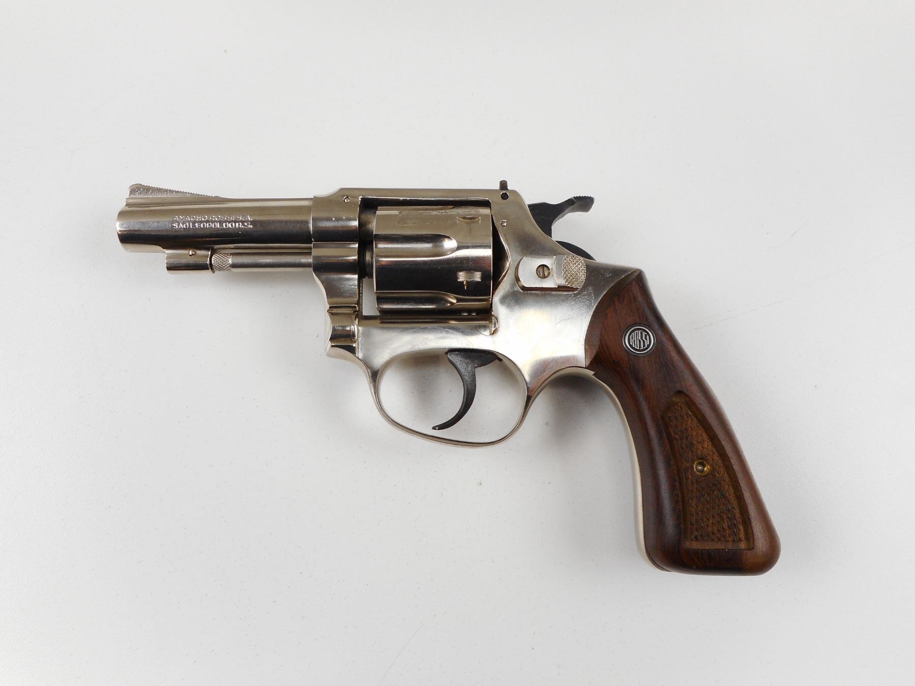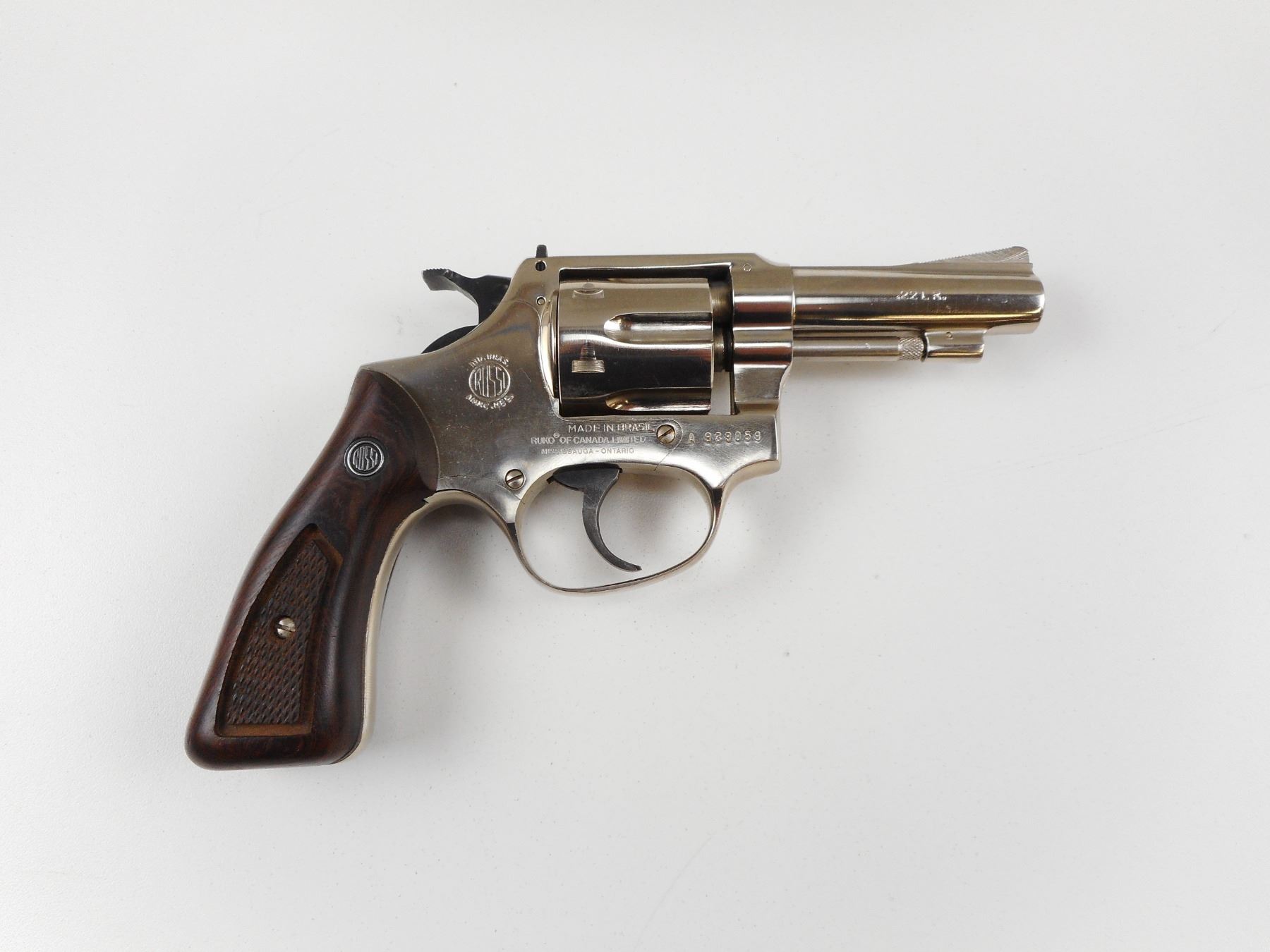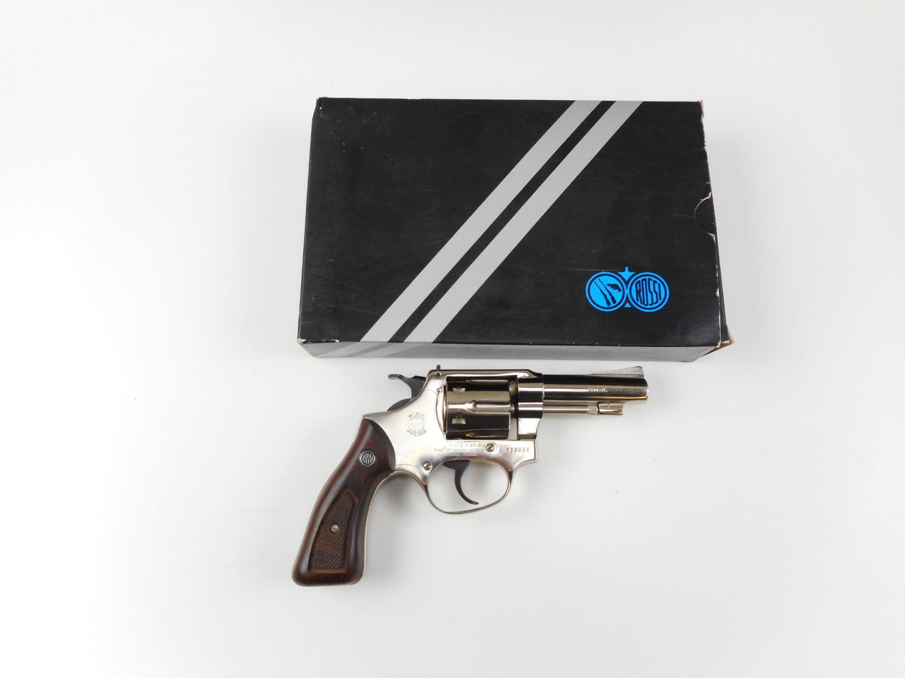 ROSSI , MODEL: 70 , CALIBER: 22 LR , COMES WITH ORIGINAL BOX, 6 SHOT CAPACITY, BORE IS VERY GOOD, RAMP FRONT AND RAISED NOTCH REAR SIGHTS, HOLDS COCK, INDEXES WELL, ACTION IS TIGHT, CHECKERED WOOD GRIP PANELS WITH ROSSI LOGO, SHOWS VERY LITTLE HANDLING MARKS , ACTION: REVOLVER , BARREL LENGTH: 76MM , CONDITION: 8/10 , STOCK# 2485 , SERIAL # A939059 , CLASS: CANADIAN PROHIBITED CLASS
