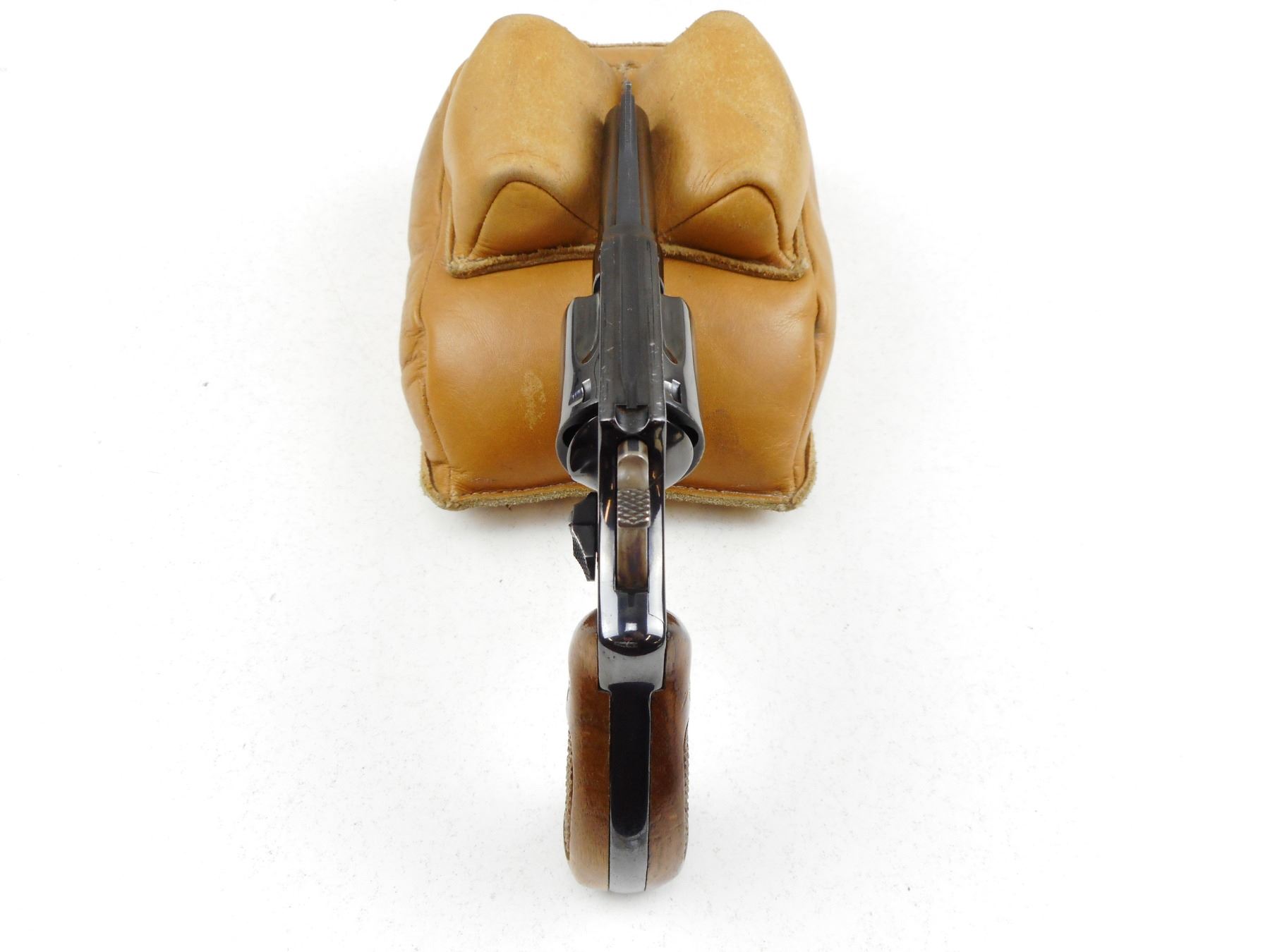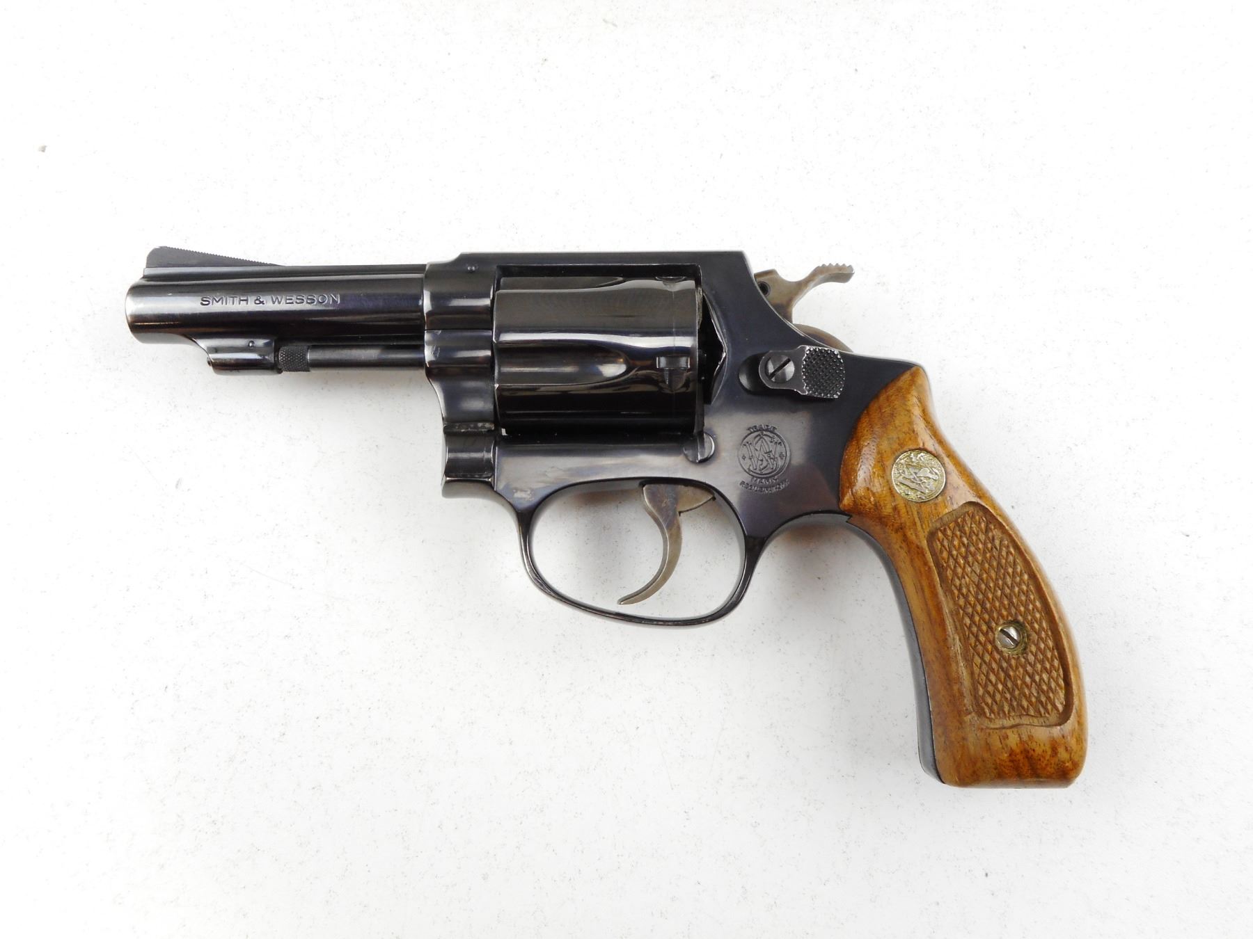 SMITH & WESSON , MODEL: 36 , CALIBER: 38 SPECIAL , 5 SHOT CAPACITY, VERY GOOD BORE, RAMP FRONT AND GROOVED REAR SIGHT, CHECKERED WOOD GRIP PANELS WITH S&W LOGO, SHOWS VERY LITTLE HANDLING MARKS , ACTION: REVOLVER , BARREL LENGTH: 76MM , CONDITION: 8/10 , STOCK# 2523 , SERIAL # 446J69 , CLASS: CANADIAN PROHIBITED CLASS