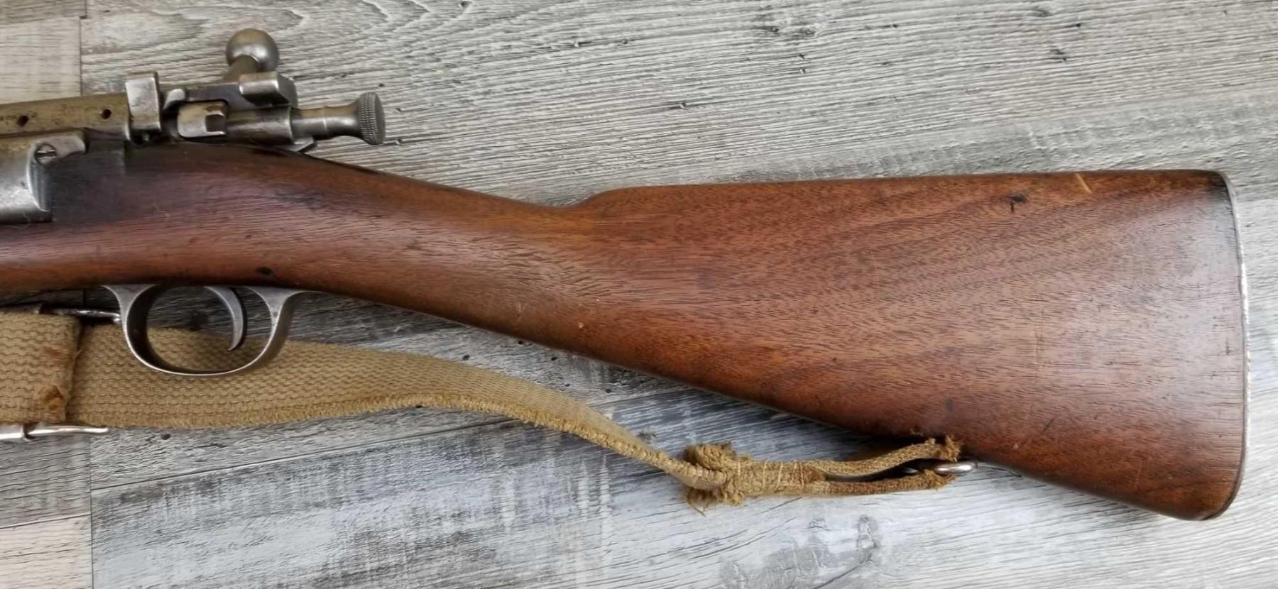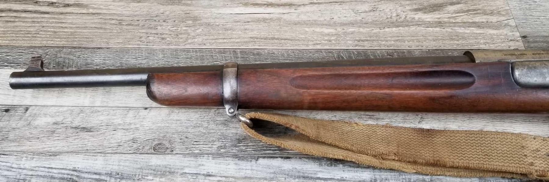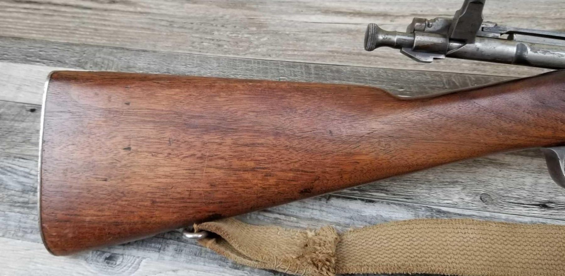 HAS BEEN DRILLED AND TAPPED. WOOD SHOWS PROOF MARK. BORE IS GOOD. VINTAGE WEB SLING.