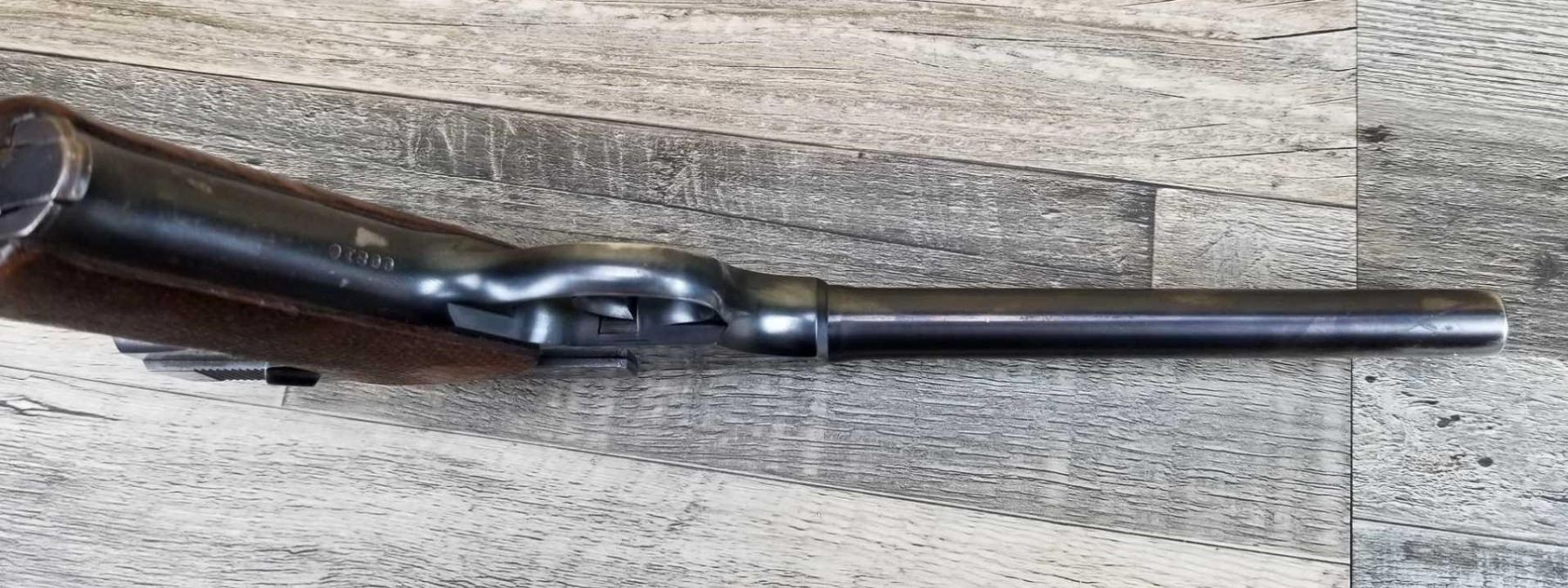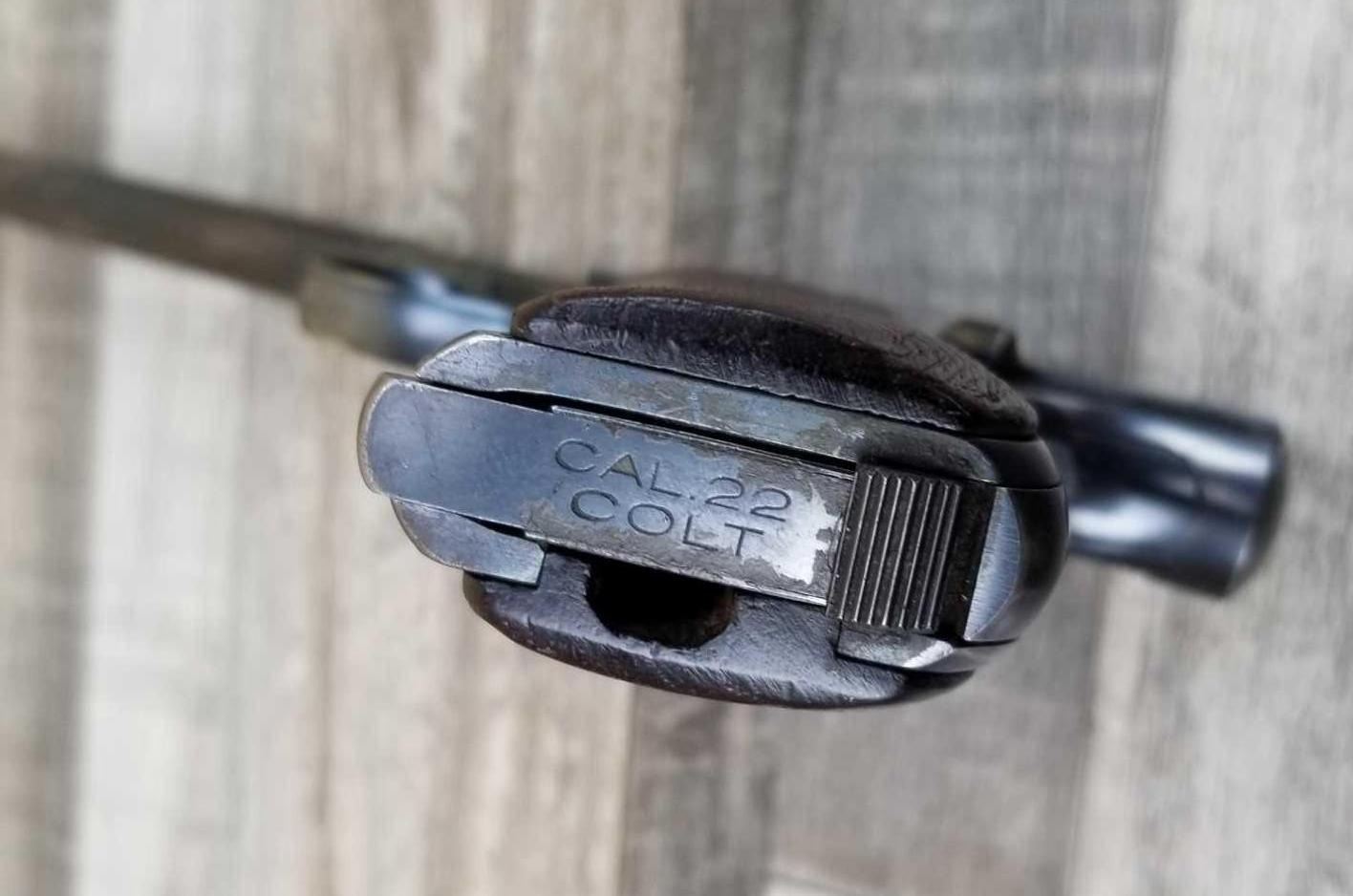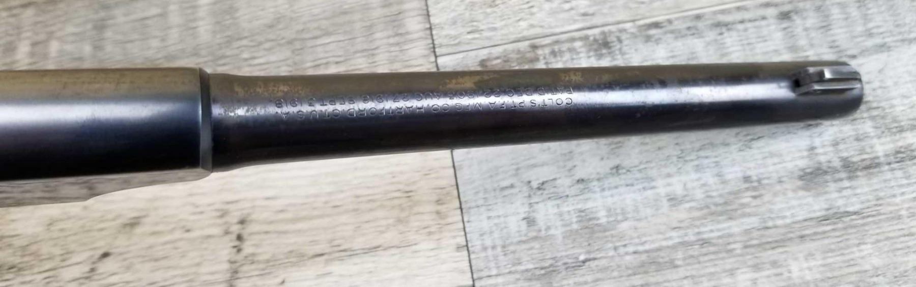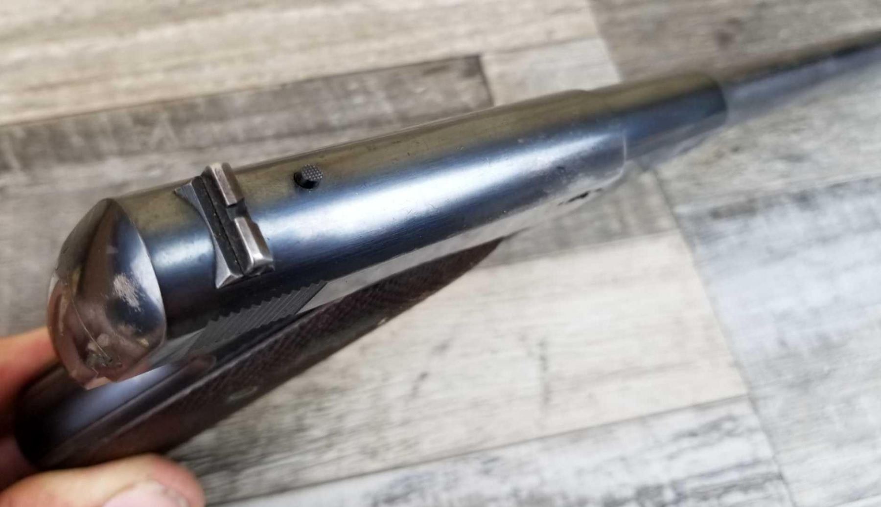 LEFT SIDE OF BARREL SHOWS CONSIDERABLE WEAR AND SOME LIGHT PITTING. SHOWS HOLSTER WEAR ON MUZZLE END AND IN HIGH SHARP POINT AREAS. BORE IS EXCELLENT.