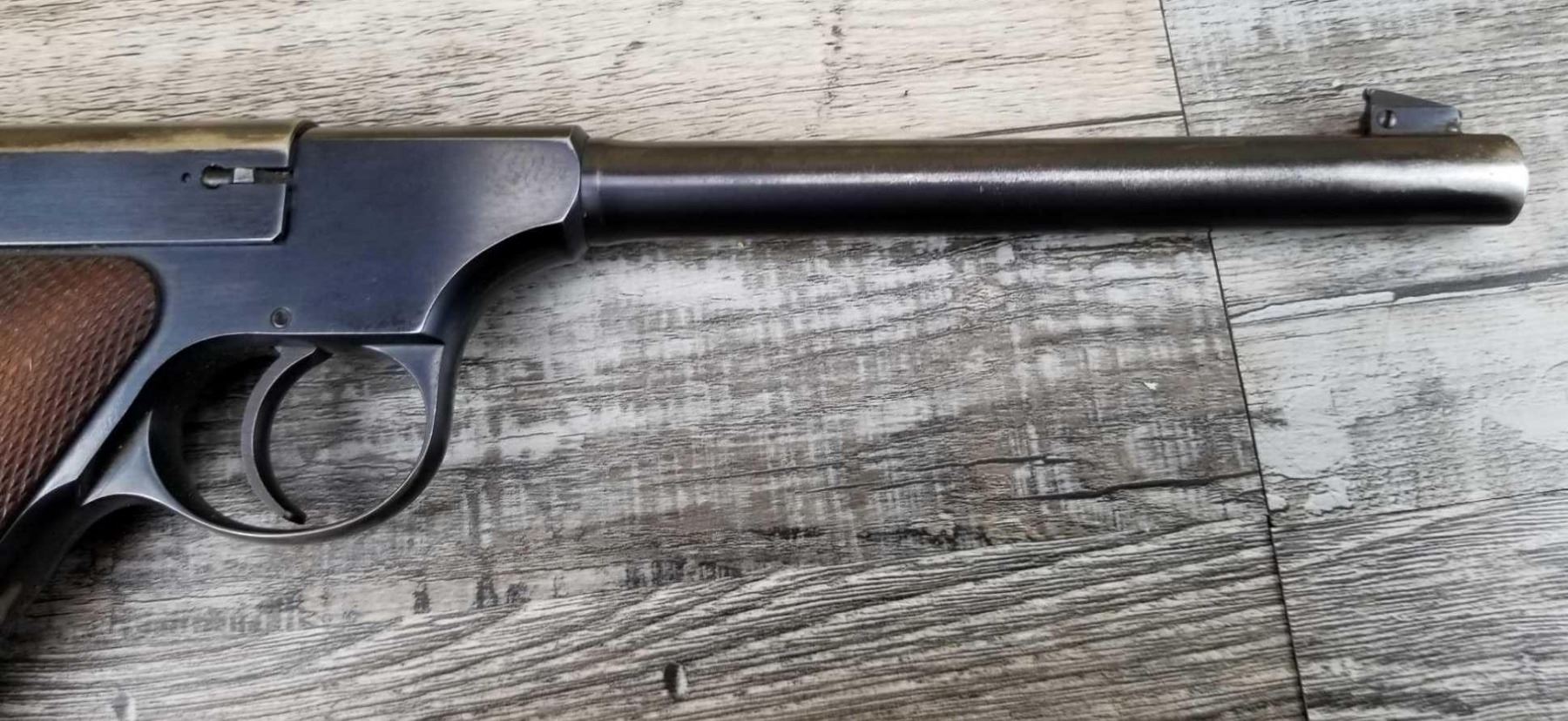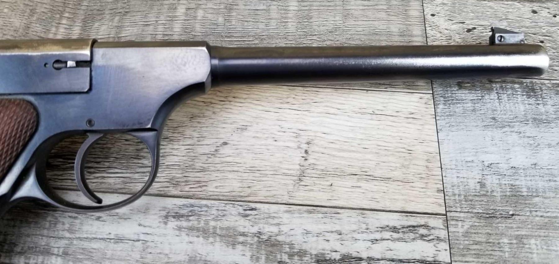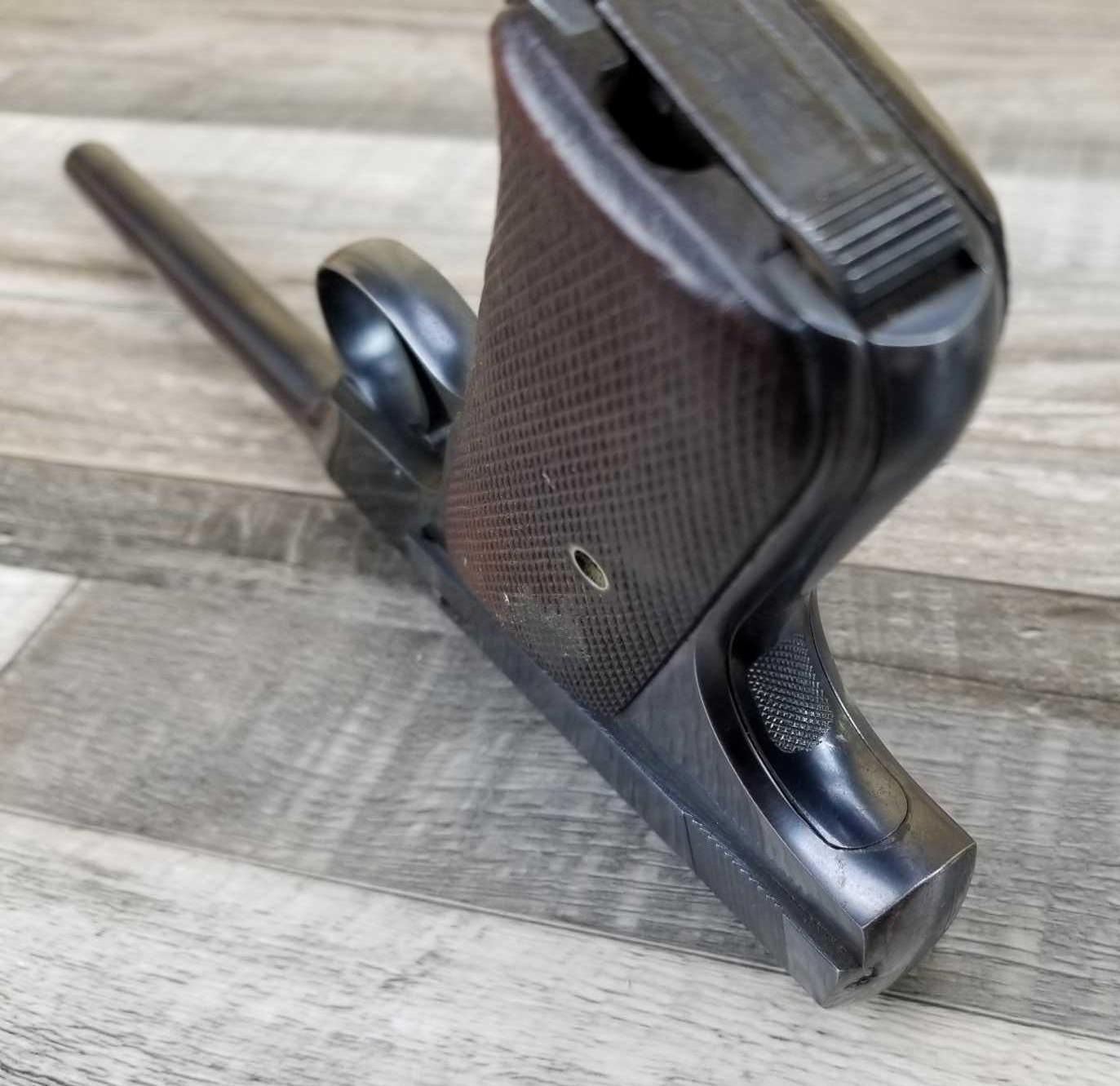 LEFT SIDE OF BARREL SHOWS CONSIDERABLE WEAR AND SOME LIGHT PITTING. SHOWS HOLSTER WEAR ON MUZZLE END AND IN HIGH SHARP POINT AREAS. BORE IS EXCELLENT.