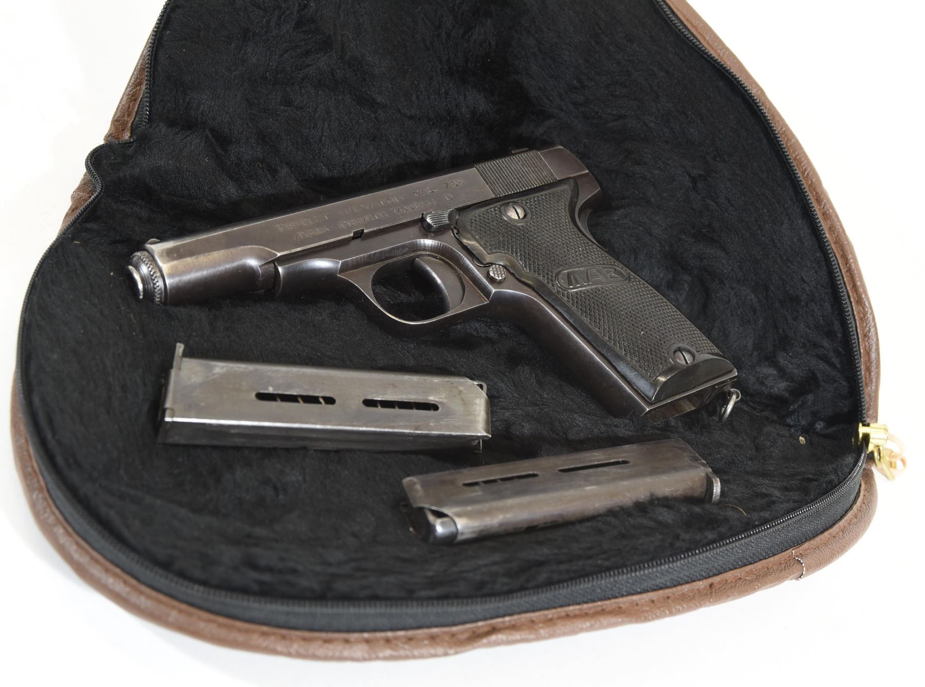 Prohibited, semi auto, 7.65mm, 102mm barrel, SN 109718. Right plastic grip worn, bluing grey and worn, bore very good. Two mags and soft case.