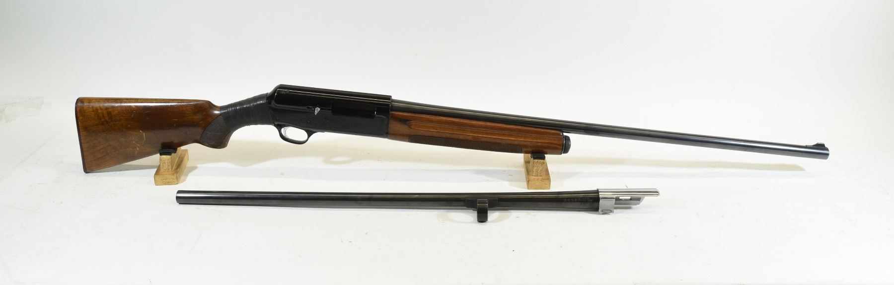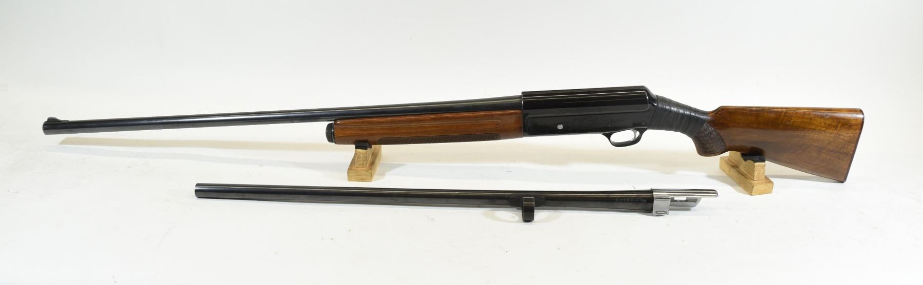 Non-restricted, semi auto, 12Ga x 2 3/4", 30" full choke and 26" skeet barrels, SN 081538. Wood has numerous marks and a cracked wrist, bluing has some marks, bores excellent.