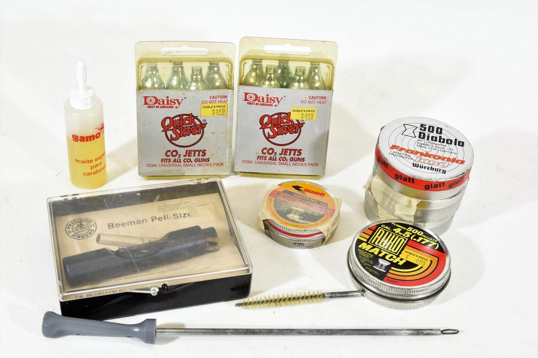 5 tins of .177 cal. pellets, 9 Daisy qick silver CO2 cannisters, Beeman Pell-Size, cleaning rod with brush and patch accessorie, open bottle of Gamo oil, cannot ship pick up only because of Co2 cannisters