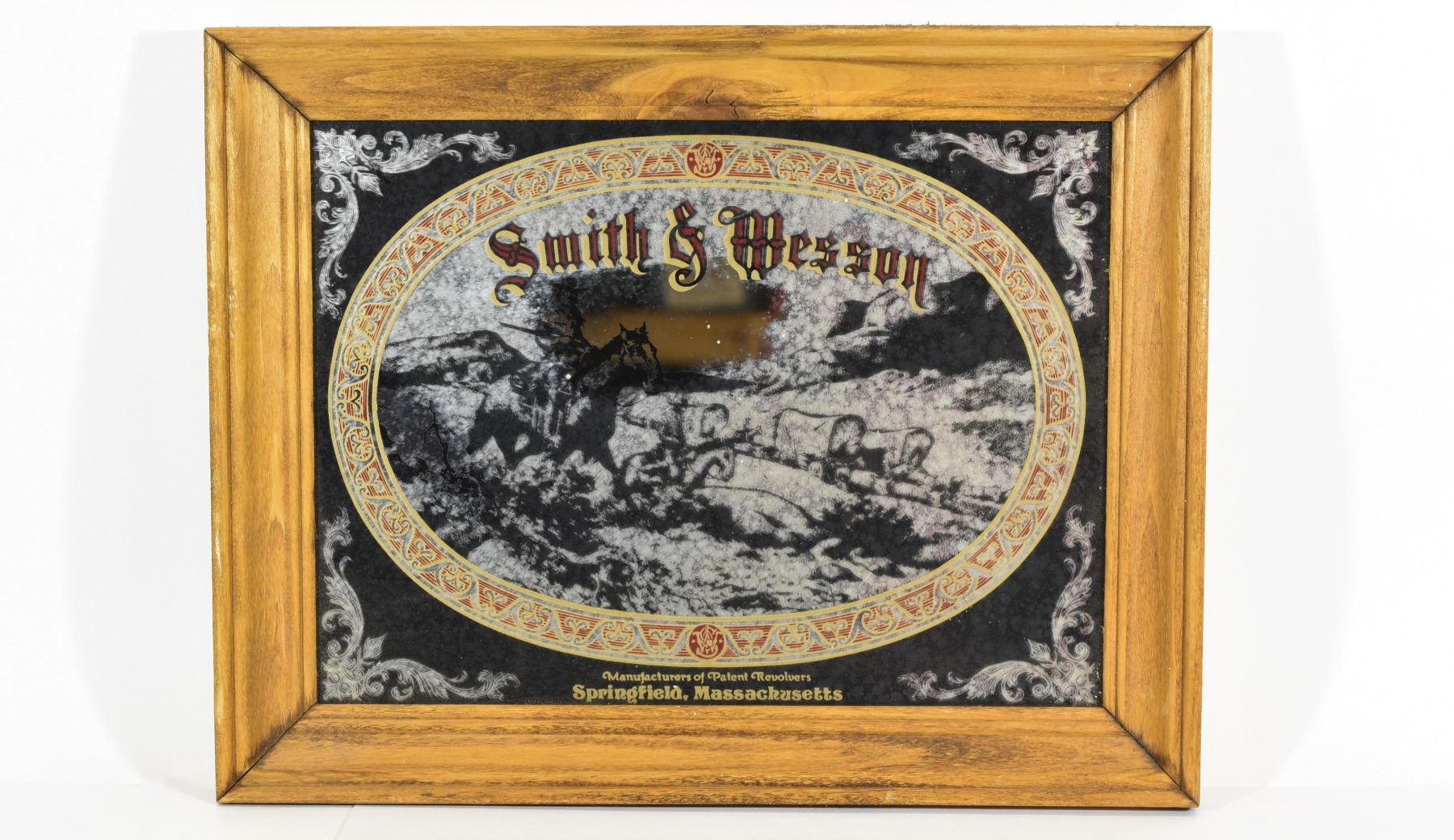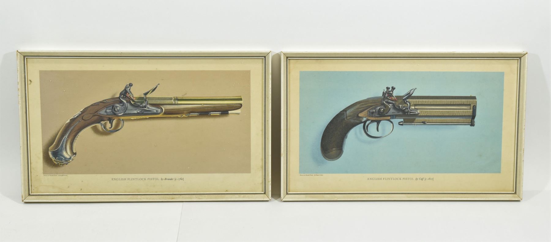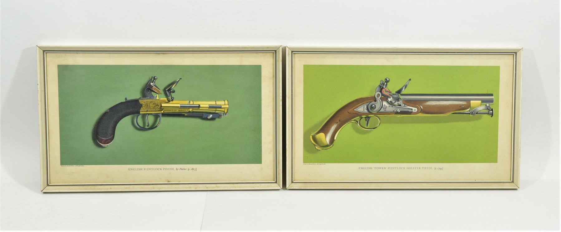 4 - 10" X 17" pictures of four different English flintlock pistols and a Smith & Wesson mirrored picture 11 1/2" X 8 1/2"