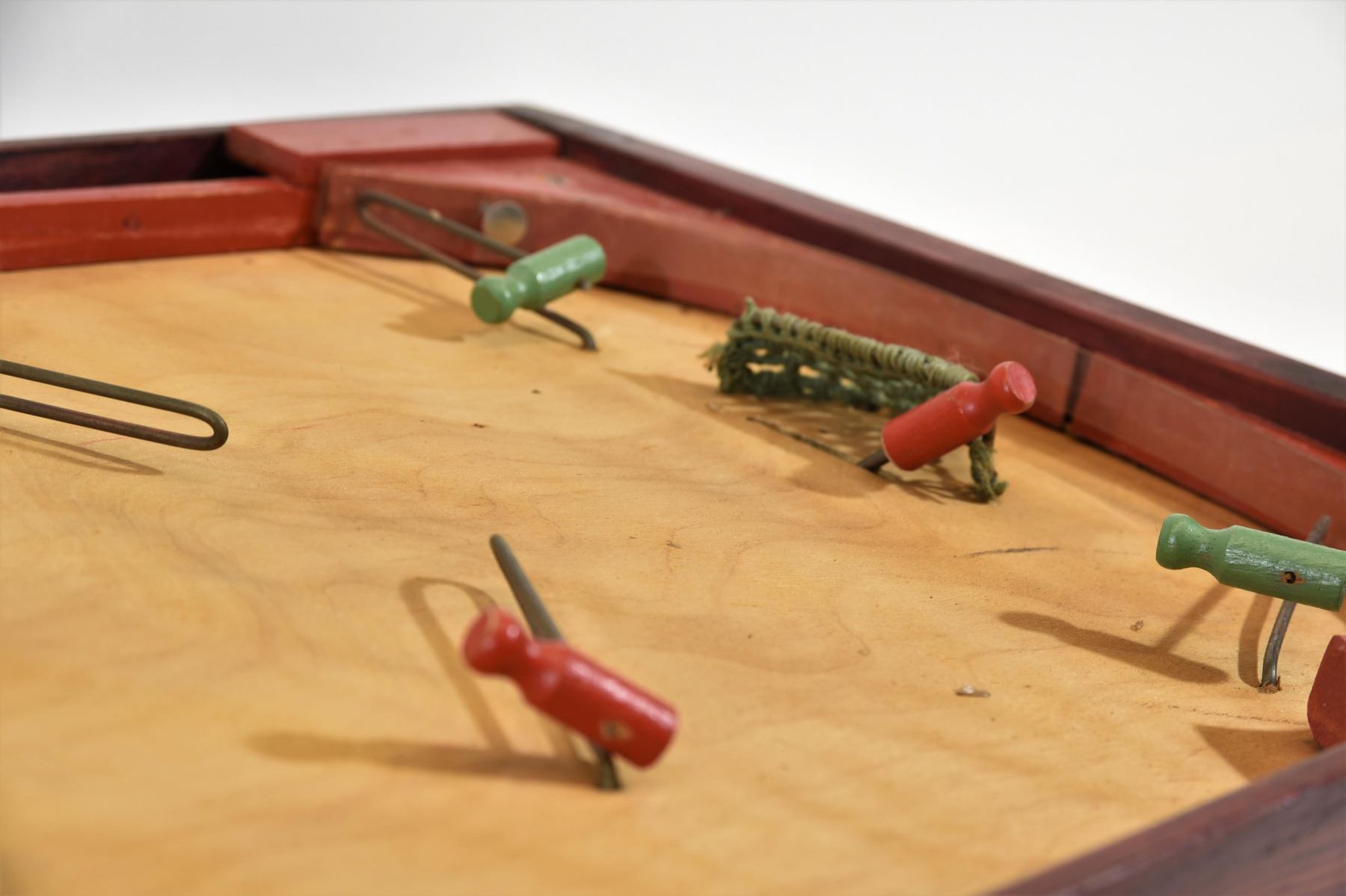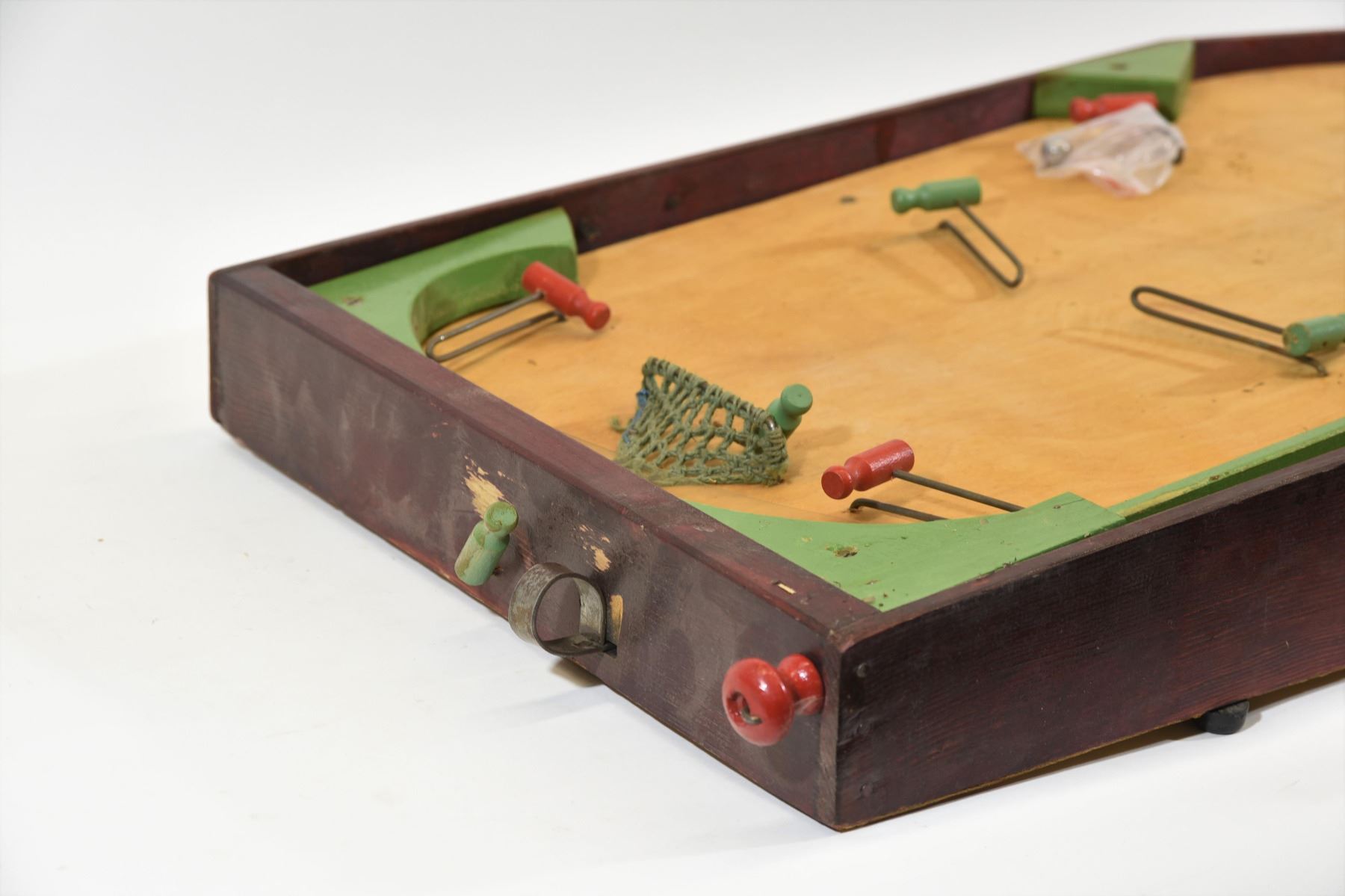 Antique wooden hockey game, in good working order, has original box, game has some wear on both ends where the goalie peg and player plunger are located